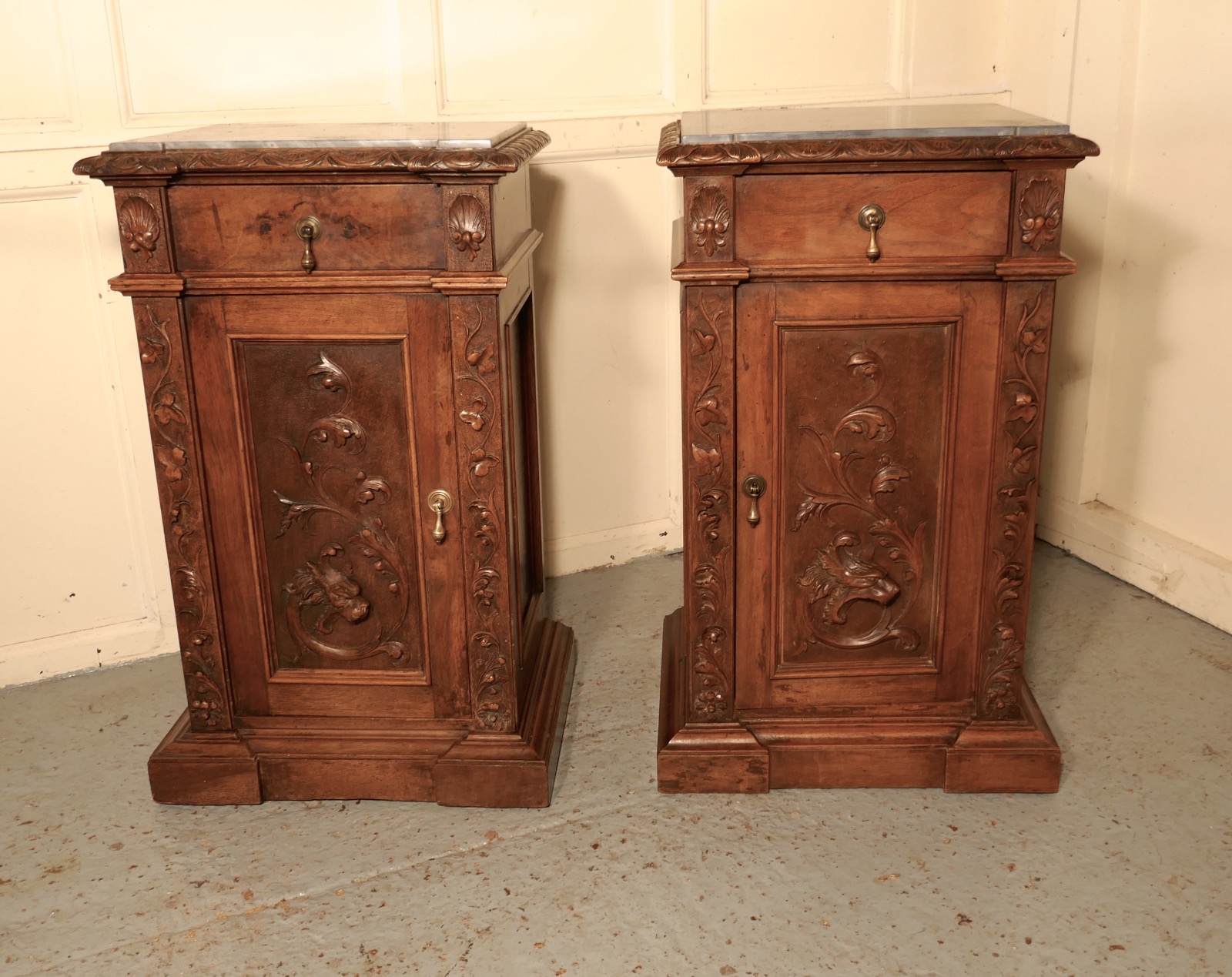 Pair of French Carved Gothic Golden Walnut Bedside Cupboards