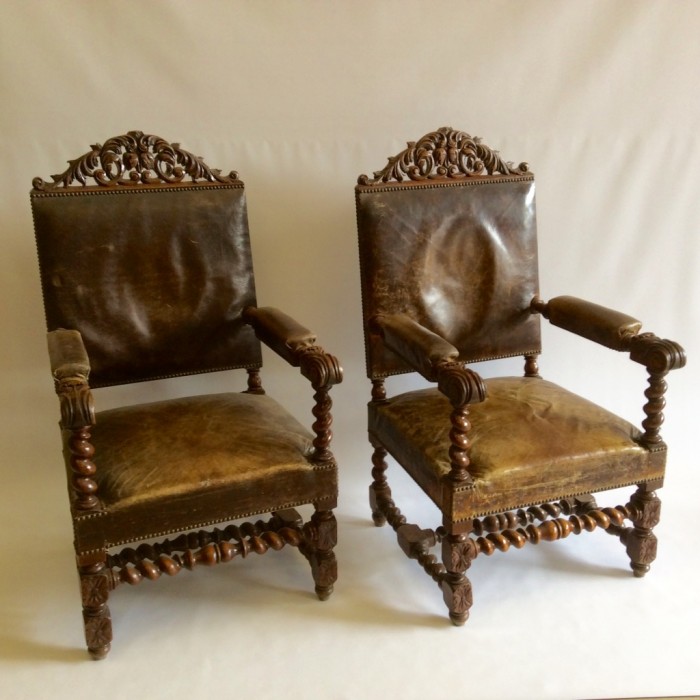 Pair of French Carved & Leather "throne" Chairs c.1880