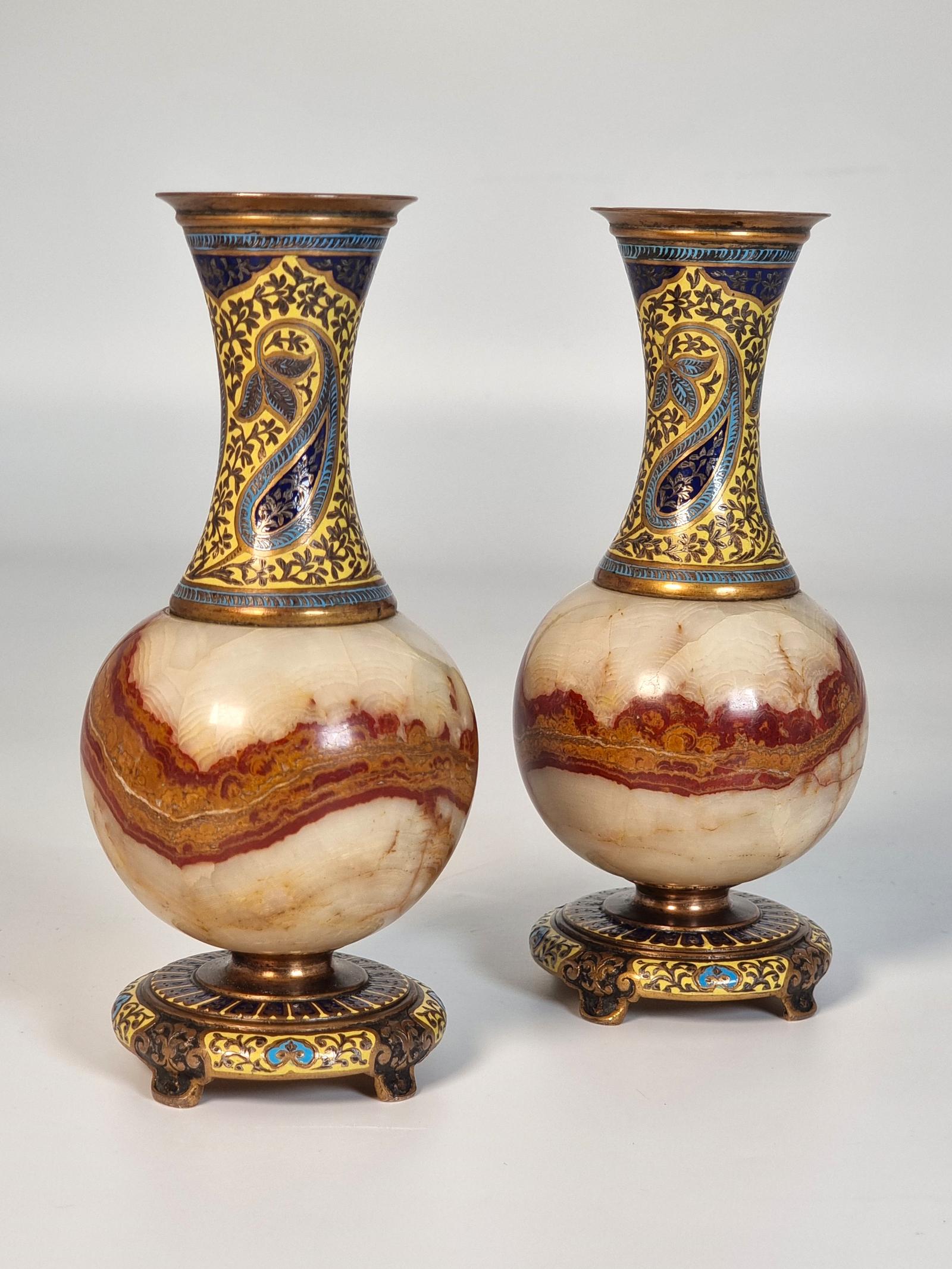 Pair of French Champlevé Enamel Ormolu & Onyx Vases c.1880