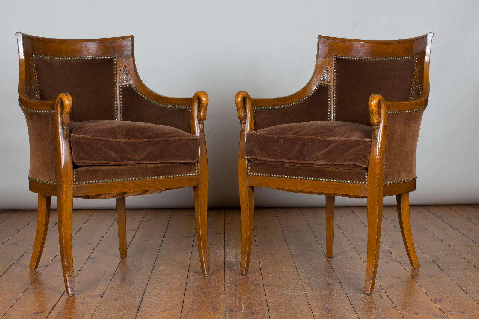 Pair of French Fruitwood Empire Style Upholstered Swan Neck Armchairs (1 of 1)