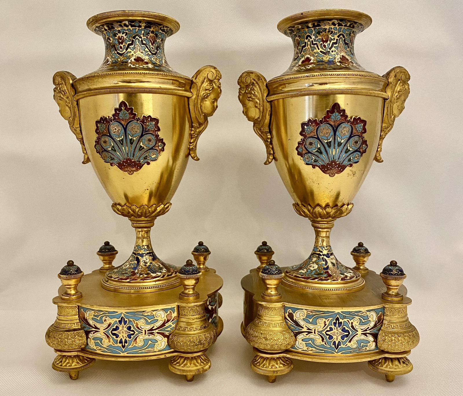Pair of French Gilt & Champlevé Enamel Vases c.1880