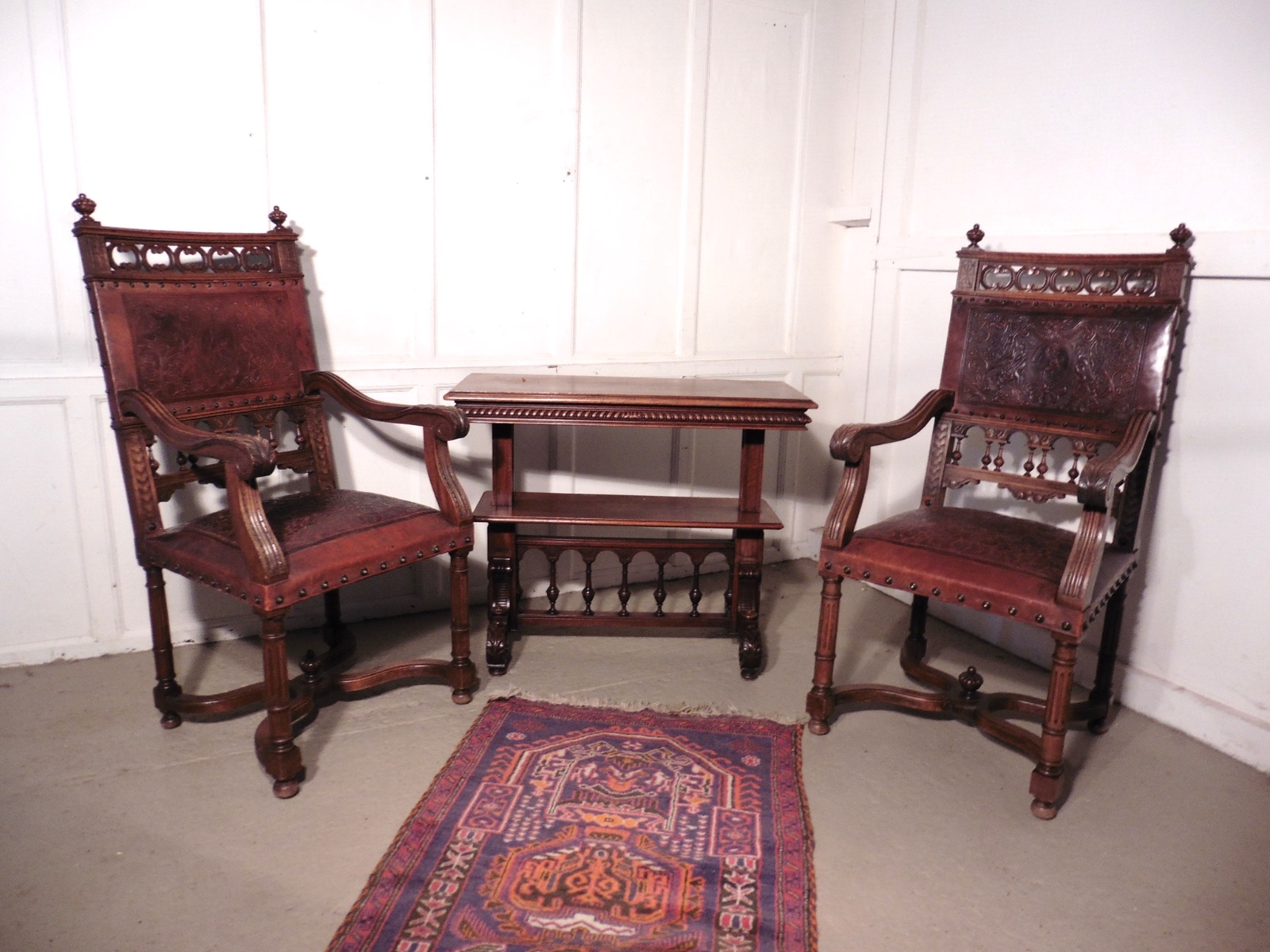 Pair of French Gothic Walnut and Leather Library Chairs c.1880