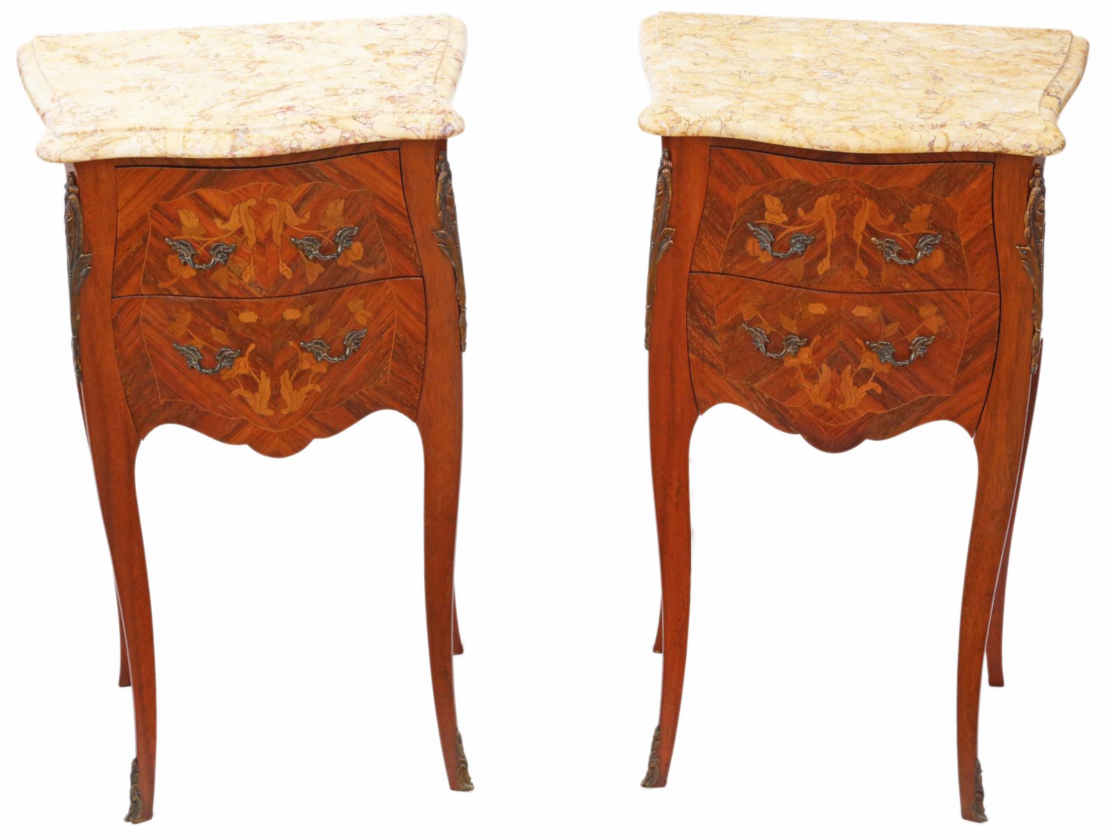 Pair of French Inlaid Marquetry Marble Bedside Tables Cupboards