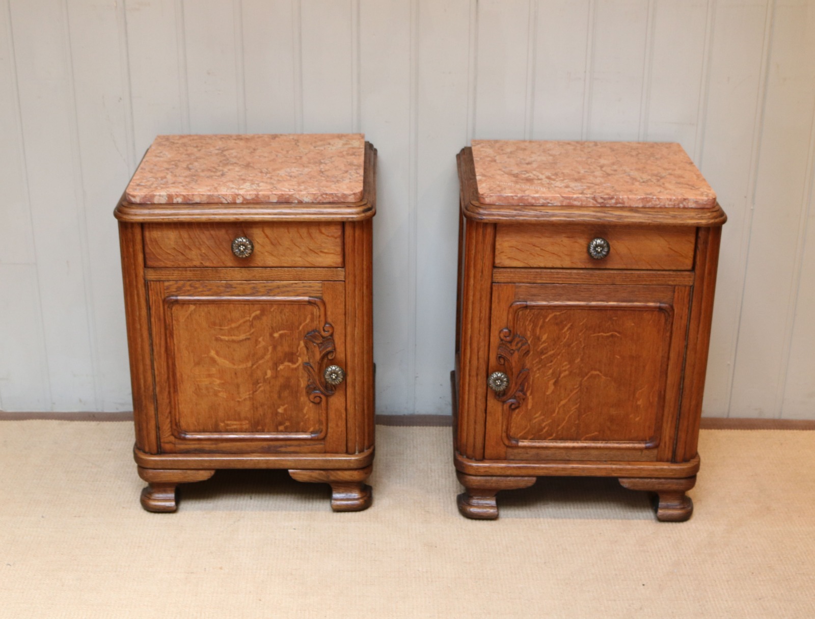 Pair of French Oak Marble Top Bedside Cabinets