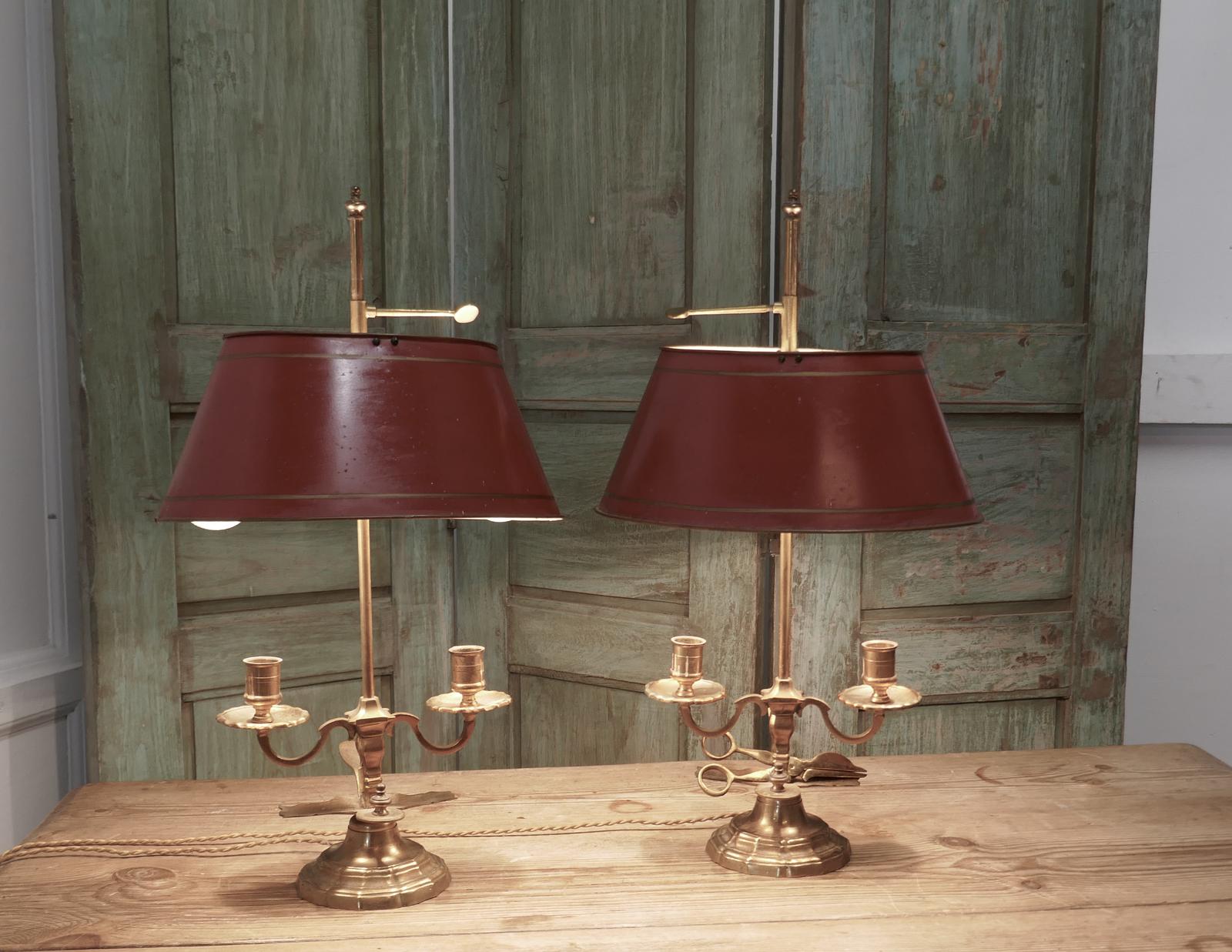 Pair of French Painted Toleware and Brass Twin Table Lamps