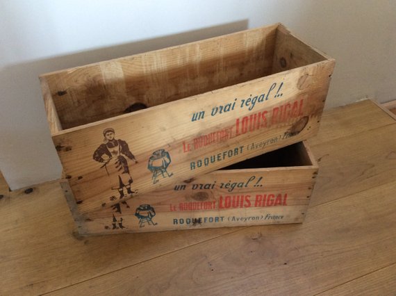 Pair of French Popular Wood Roquefort Cheese Boxes with Decals