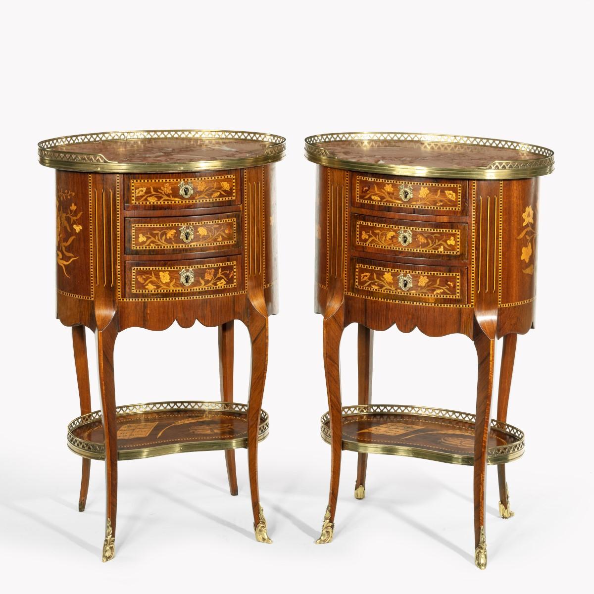 Pair of French Rosewood Oval Marquetry Bedside Tables with Marble Tops