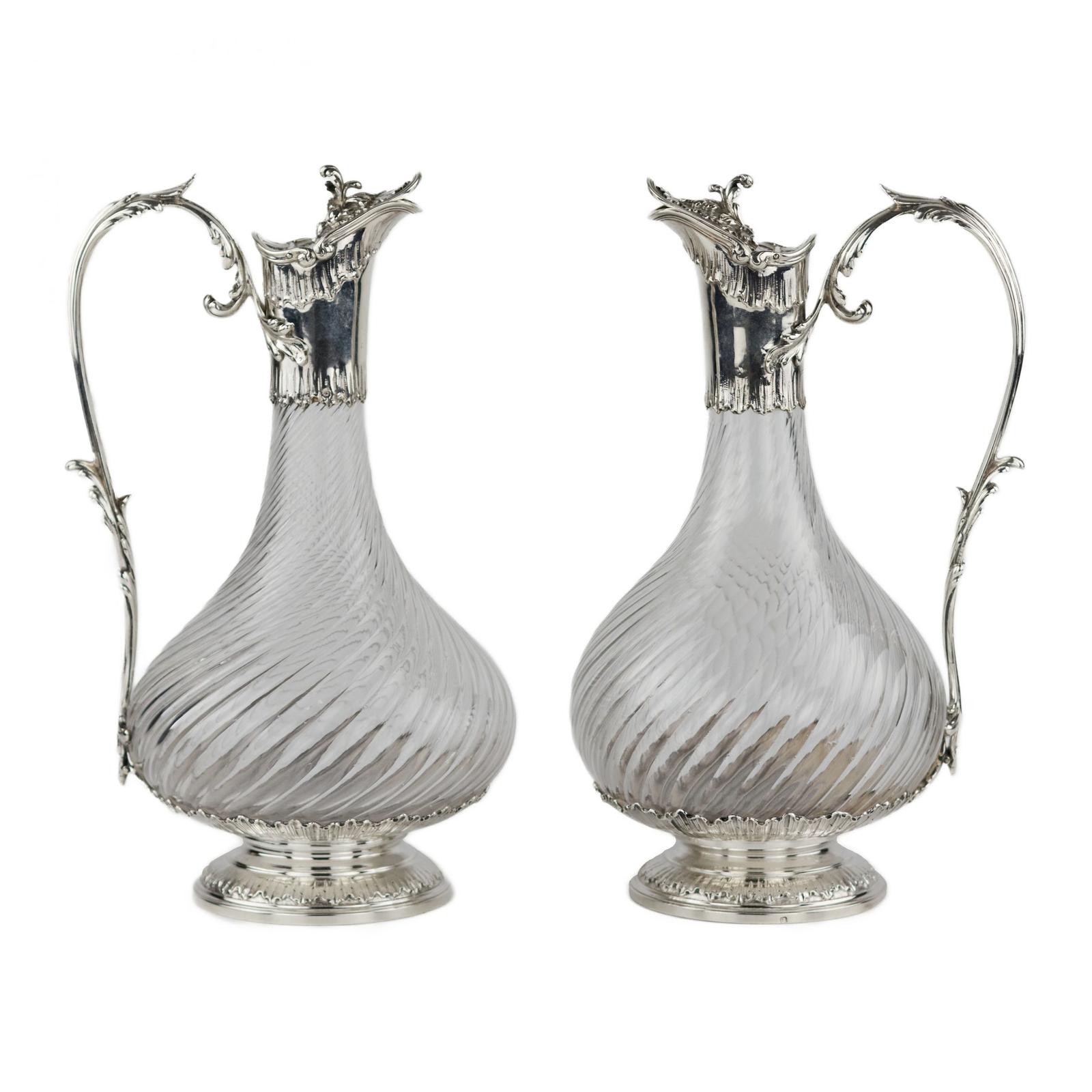 Pair of French, spiral glass wine jugs with silver. Late 19th century.
