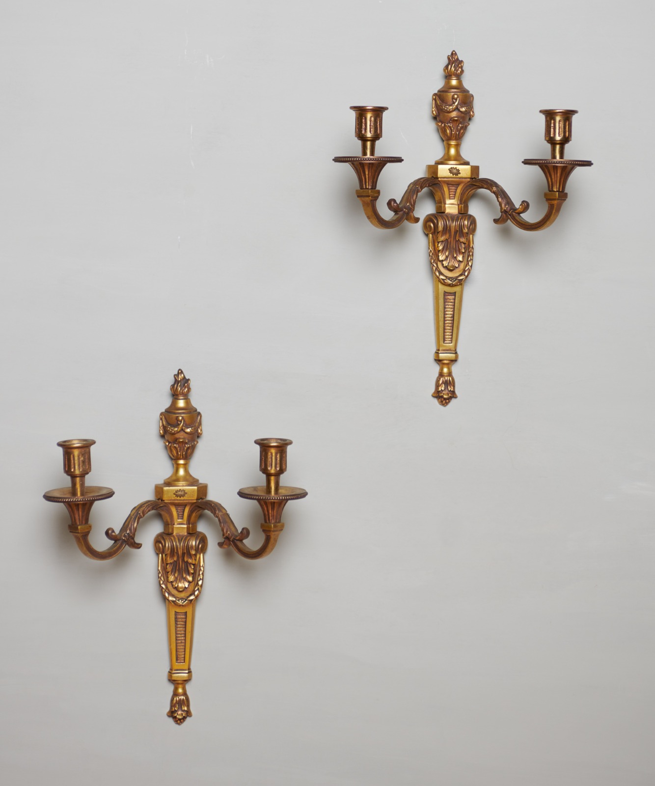 Pair of French Twin Arm Brass Torch Top Wall Sconces