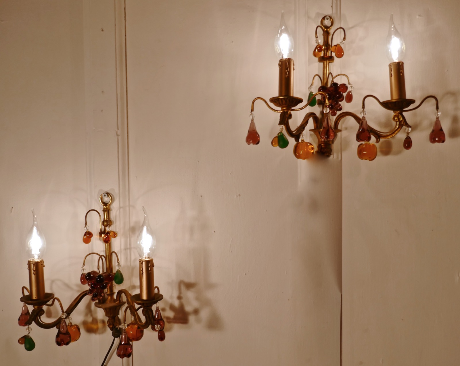 Pair of French Twin Wall Lights Hung with Crystal Fruit