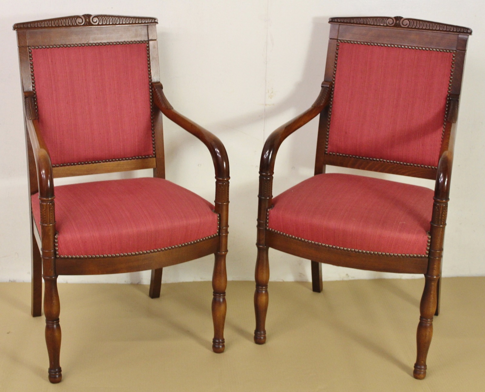 Pair of French Upholstered Mahogany Scroll Armchairs c.1900