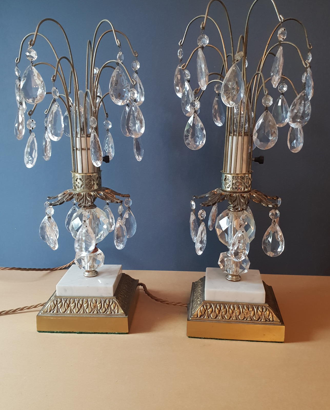 Pair of French Vintage Crystal Waterfall Table Lamps, Rewired & Pat Tested