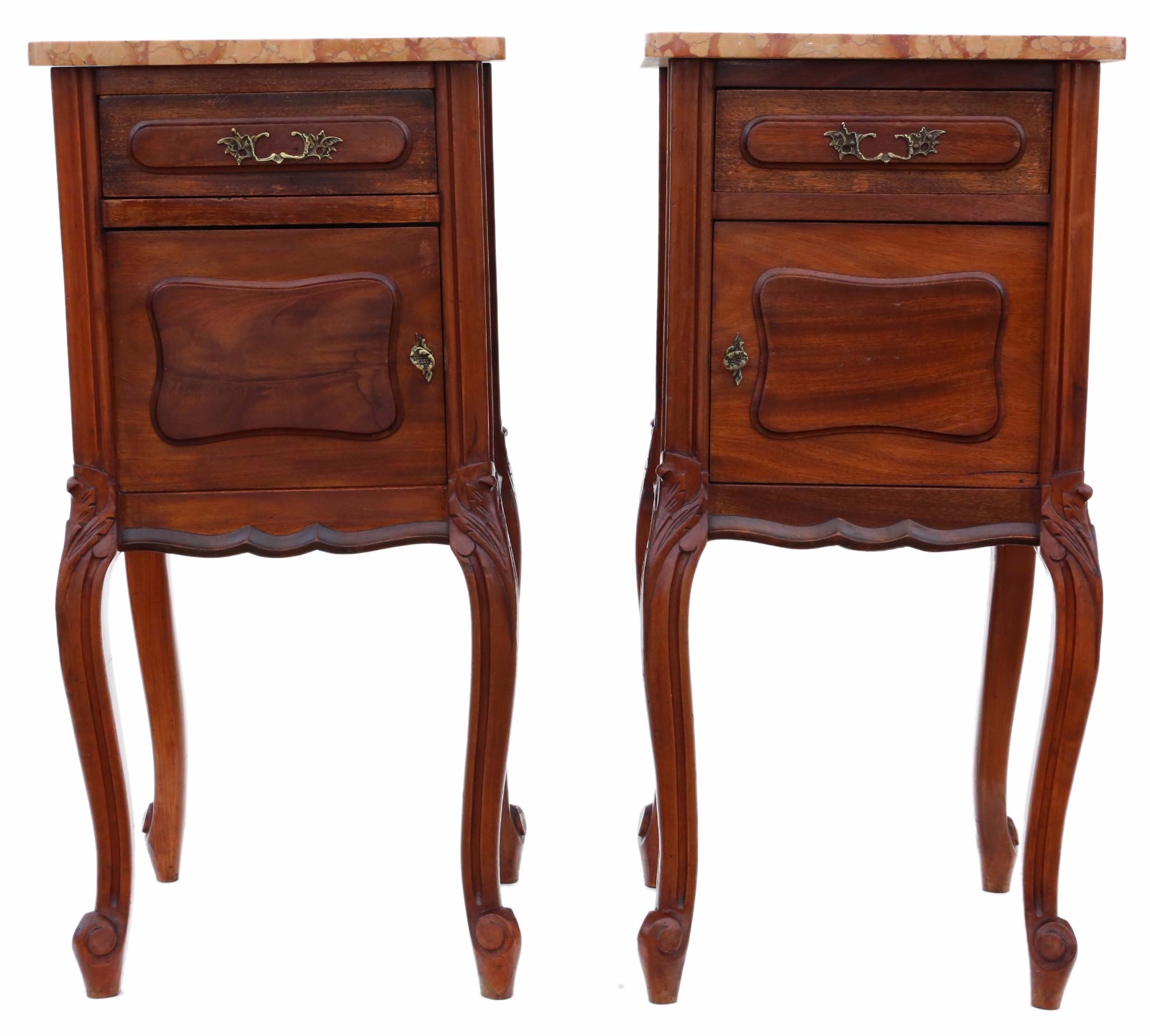 Pair of French Walnut Marble Bedside Tables Cupboards Cabinets