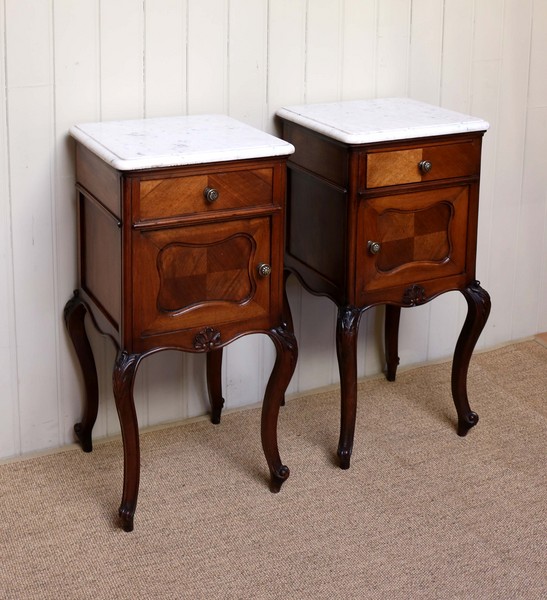 Pair of French Walnut Marble Top Bedside Cabinets c.1910