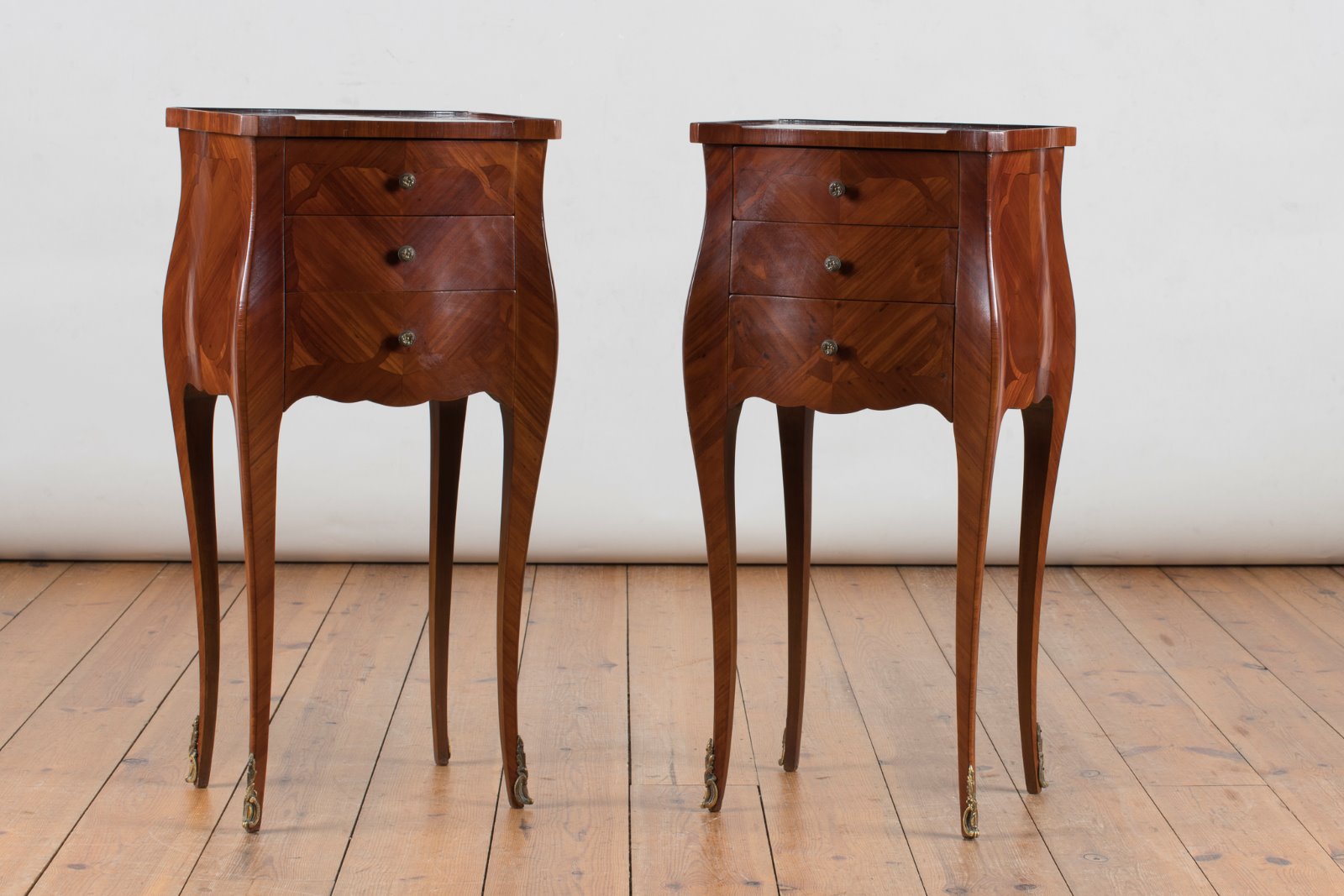 Pair of French Walnut Three Drawer Bedside Cabinets / Side Tables