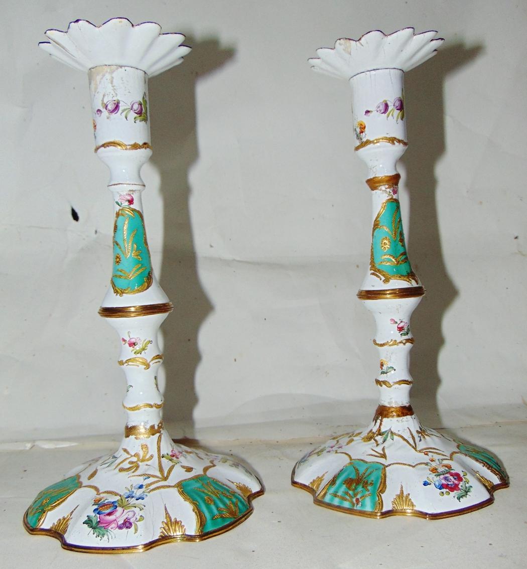 Pair of George III Battersea Enamel Candlesticks