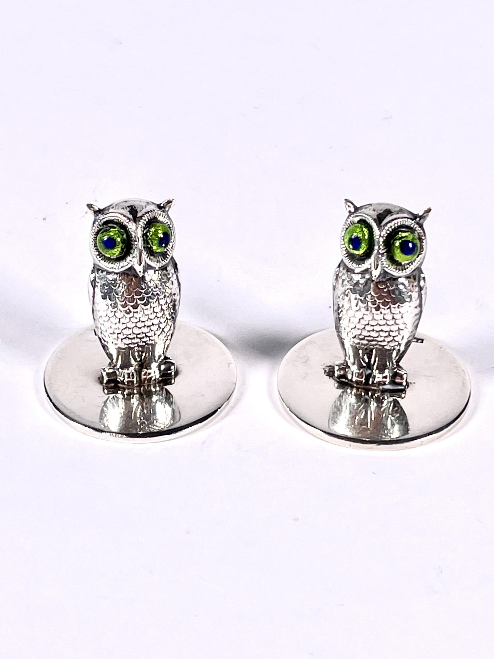 Pair of George V Novelty Silver Owl Menu Holders by Sampson Mordan