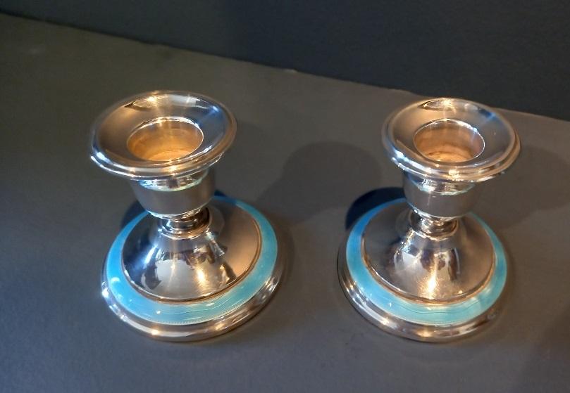 Pair of George V Period Silver & Blue Enamel Candlesticks