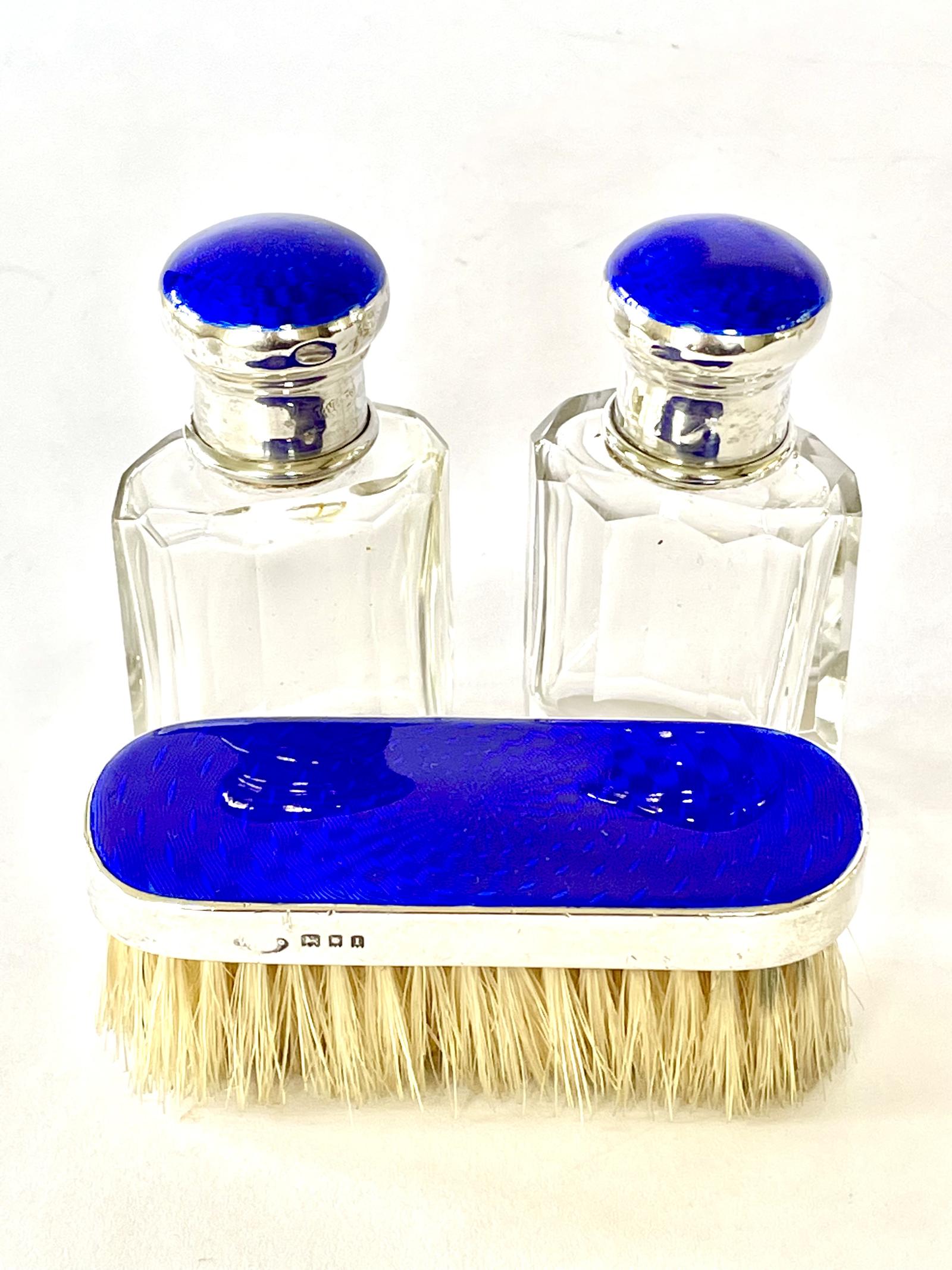 Pair of George V Silver & Beautiful Blue Enamel Scent Bottles + Matching Brush