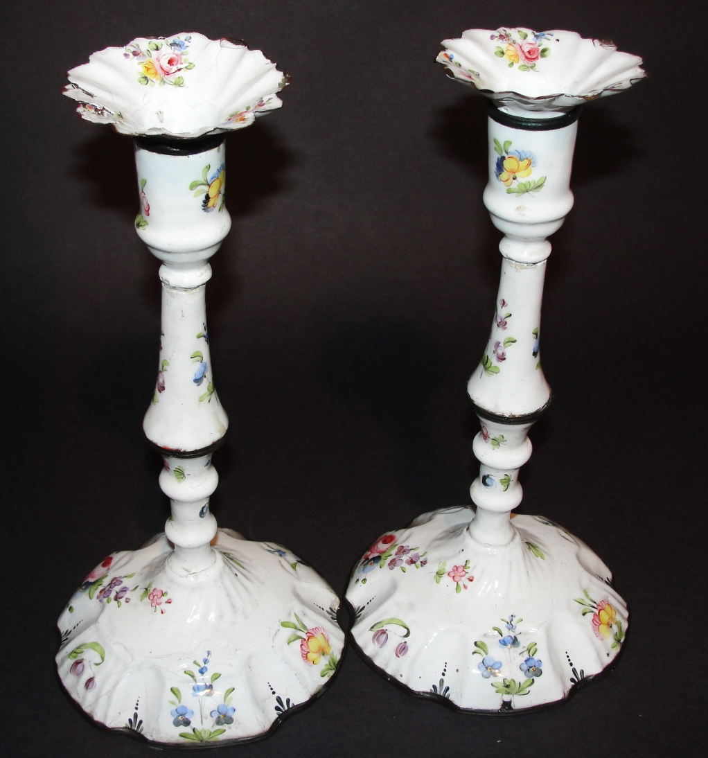 Pair of Georgian Battersea Enamel Candlesticks c.1770