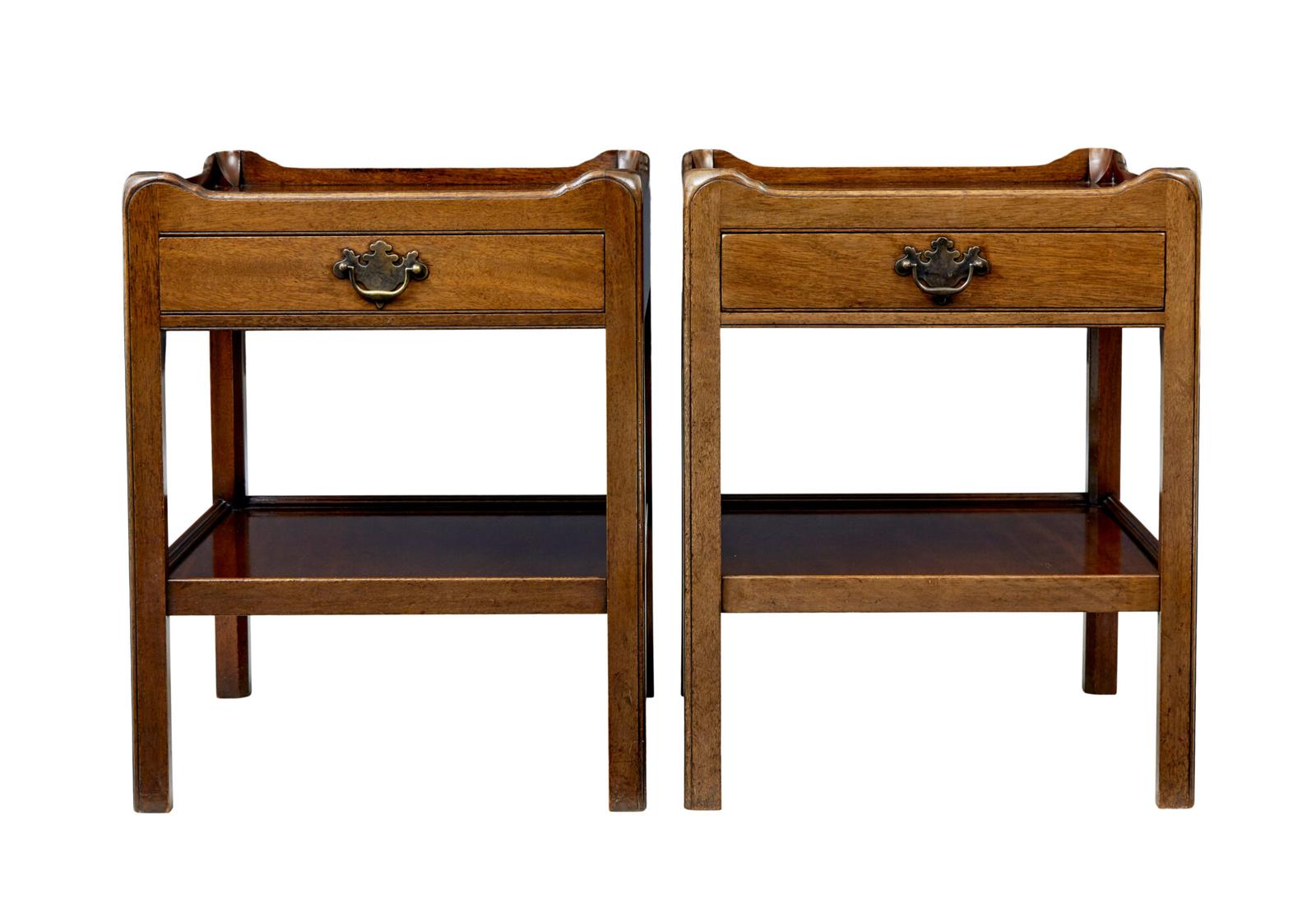 Pair of georgian influenced nightstands circa 1970. Moulded galleried tops provide a border for top surface, single drawer fitted to each with ornate brass handle. Straight legs provide support for a shelf for further storage. These tables would function perfectly also as a pair of side tables in most rooms around the home. Very minor natural surface fading, very minor surface marks to woodwork.