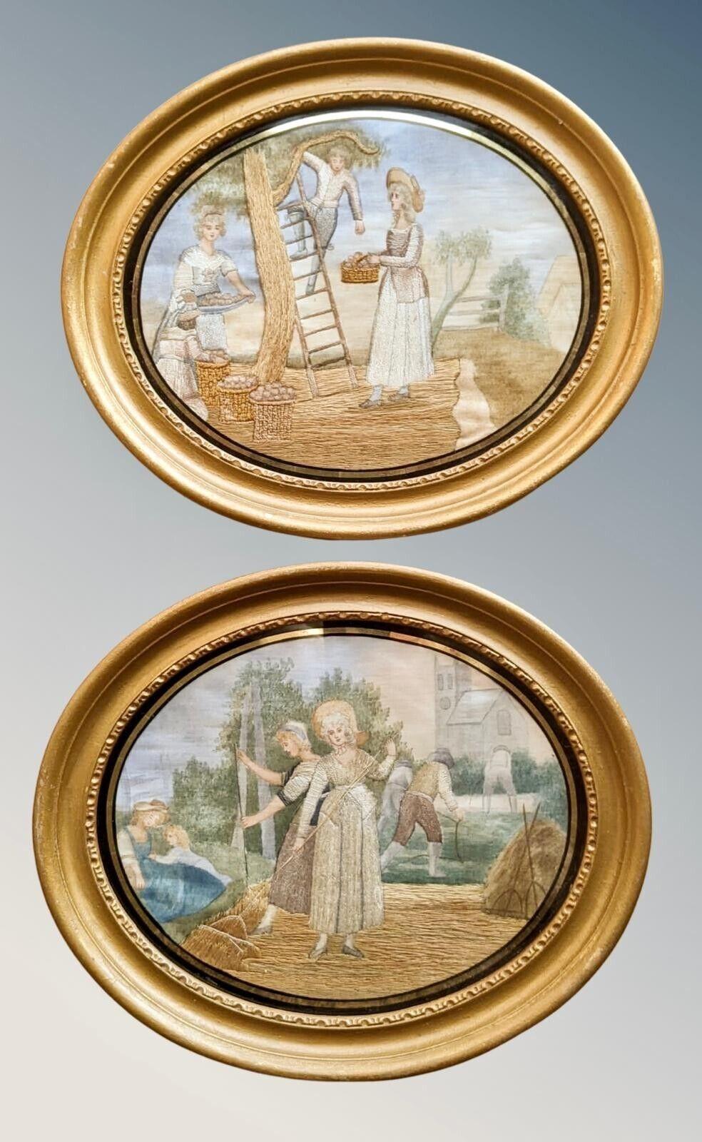 Pair of Georgian Silk Embroideries Harvesting Scenes