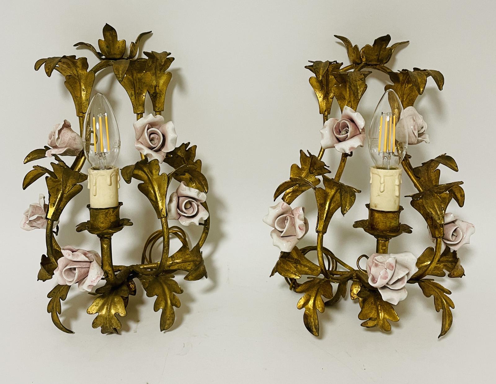 Pair of Gilt Toleware and Ceramic Wall Lights
