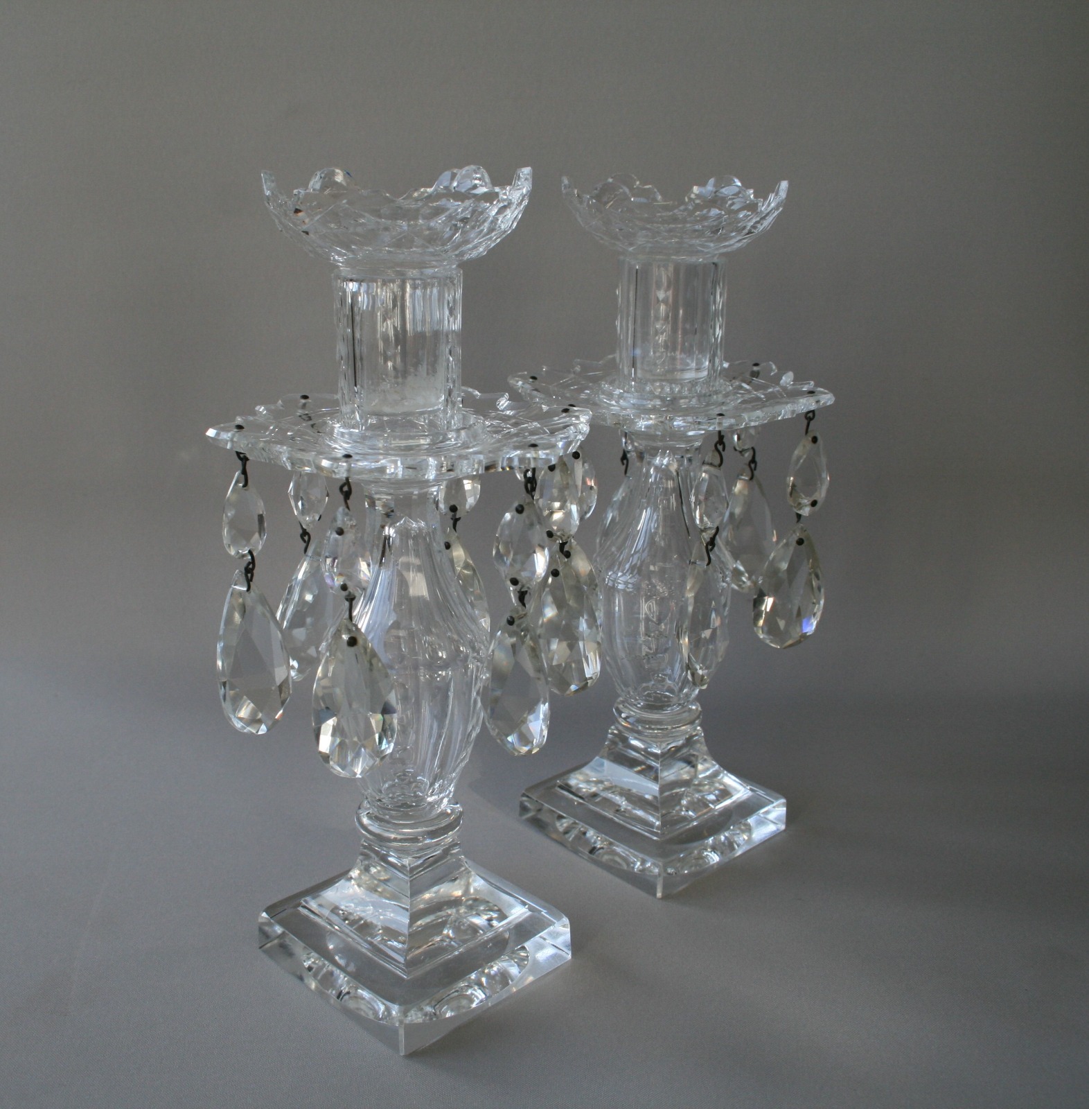 Pair of Glass Candlesticks with Glass Lustres