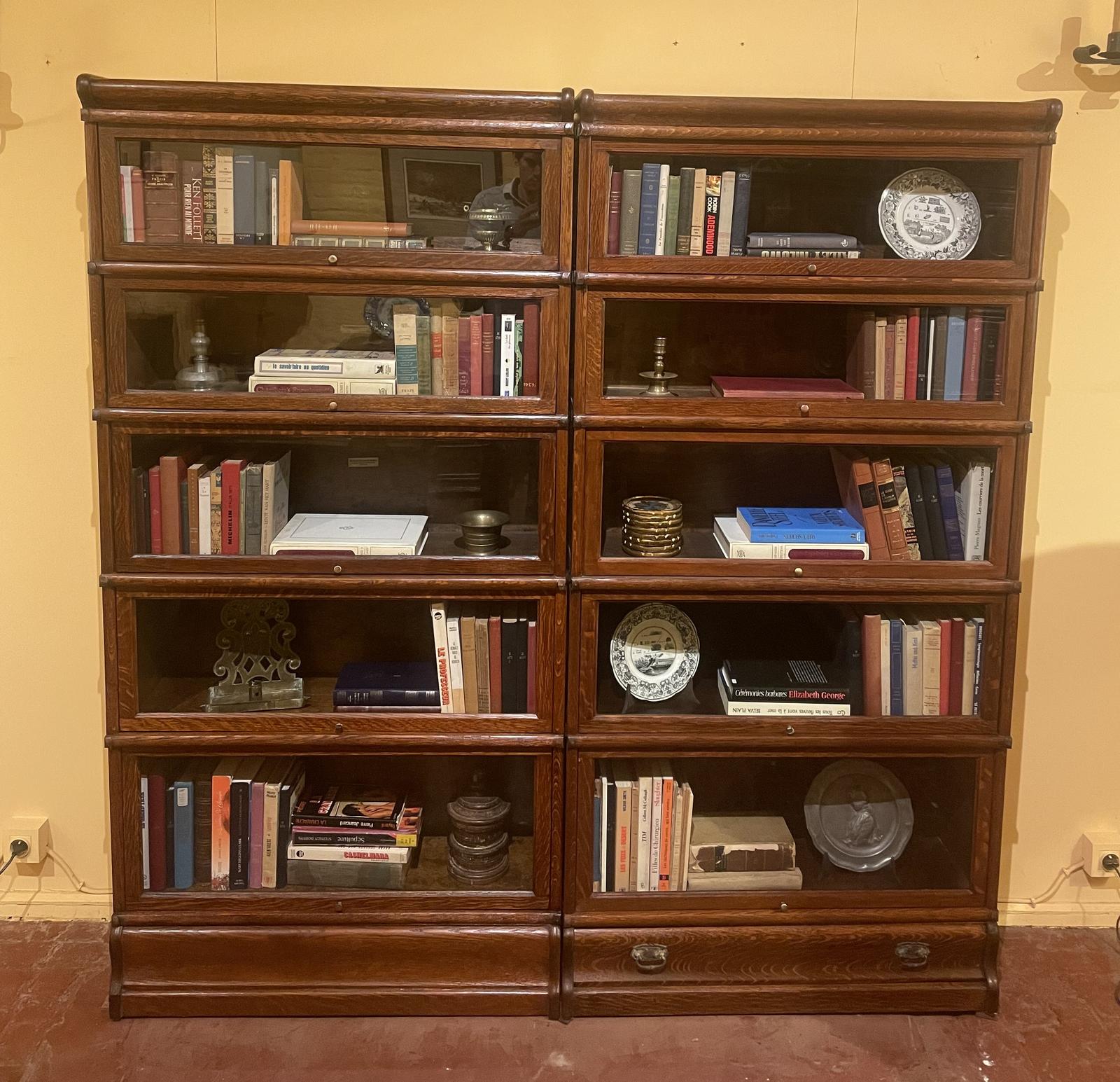 Elegant pair of Globe Wernicke London oak bookcases from the late 19th Century / early 20th Century - England. A fine pair of bookcases composed of 5 elements. We can find large deep elements which is interesting to put large books and objects. Very beautiful large model that can be placed together and form a large bookcase or separately.