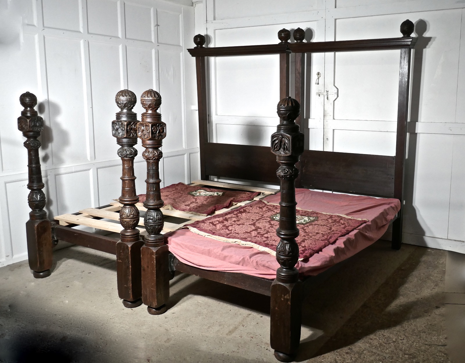 Pair of Gothic Carved Oak 4 Poster Single / Double Beds, 16th Century Carving