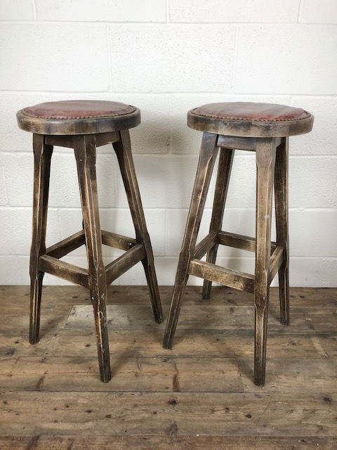 Pair of High Wooden & Leather Studded Bar Stools (1 of 1)