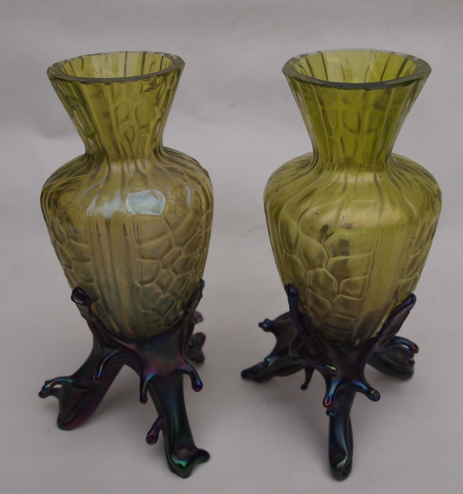 Pair of Iridescent Green Glass Vases, Faux Coral Stands c.1900