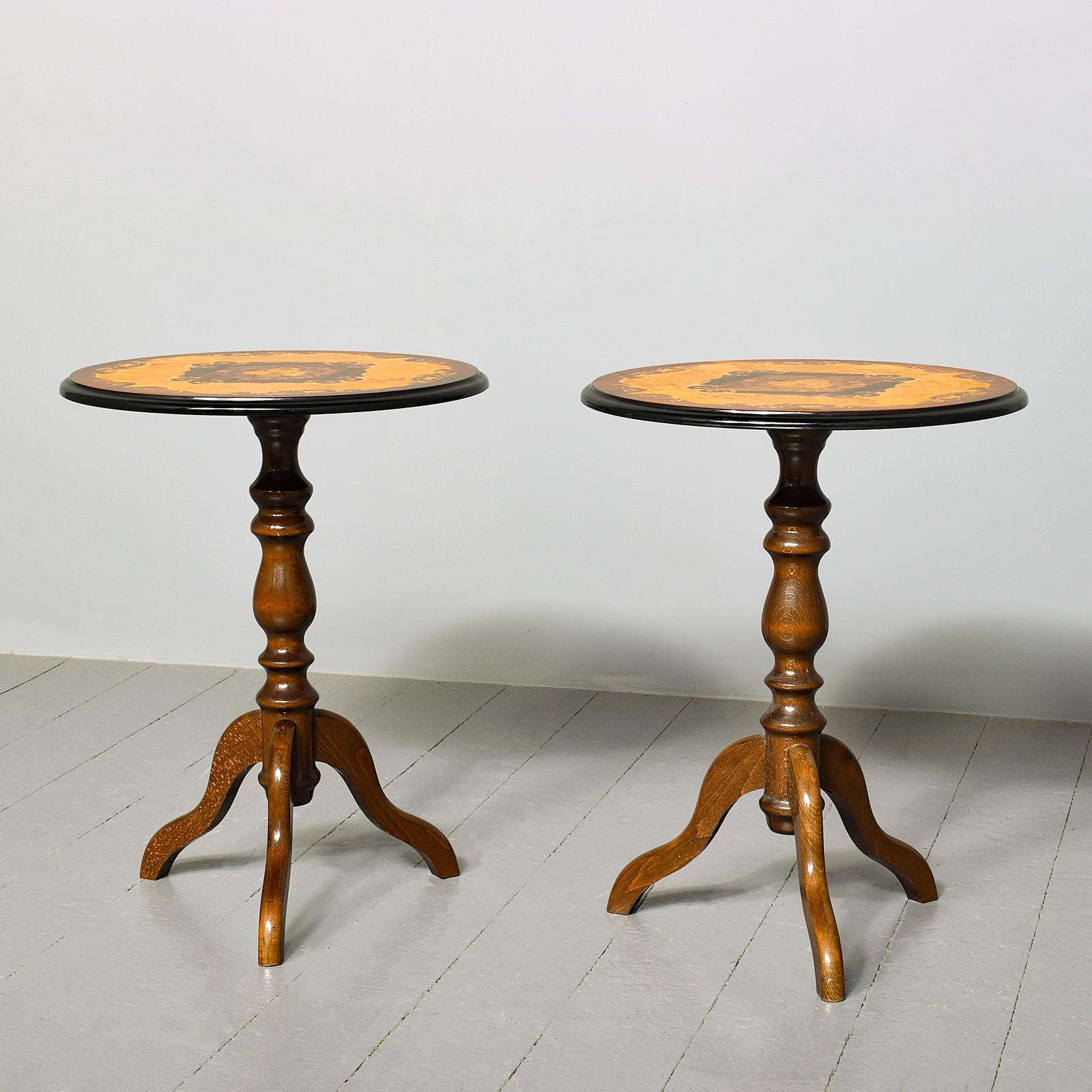 A pair of inlaid circular occasional tables from Sorrento in Italy, the tops with floral marquetry inlay and various exotic woods, including bird’s eye maple, satinwood, and dyed boxwood, with an ebonized, moulded fore-edge, support rests on turned stems, issuing three downward-facing cabriole legs, label to the underside of one table with “Made in Italy”.
