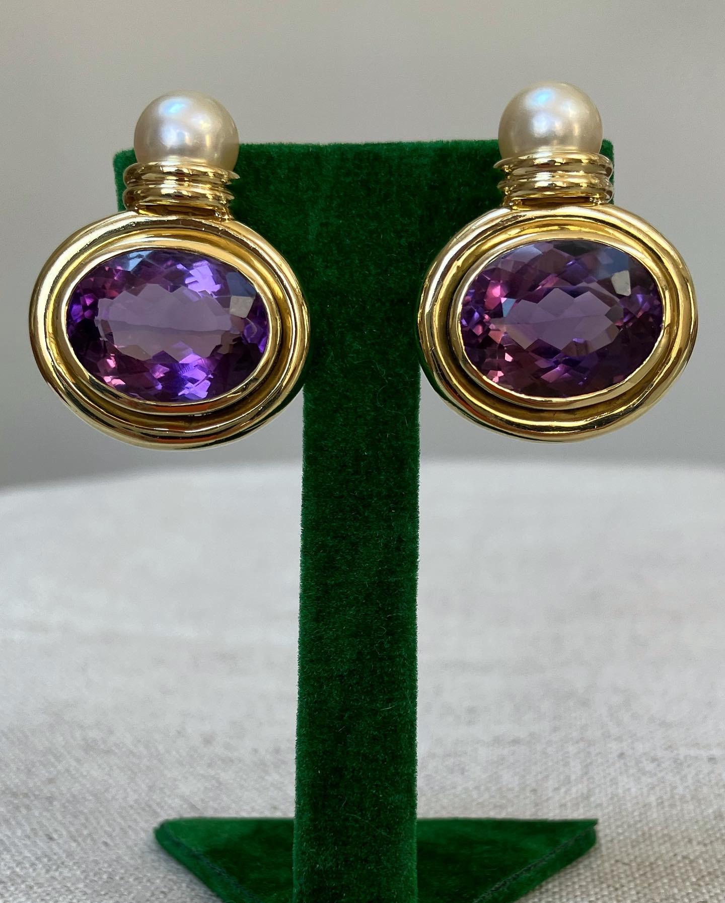 Pair Of Large 18ct Gold Oval Amethyst And Pearl Stud Earrings - 21.5g