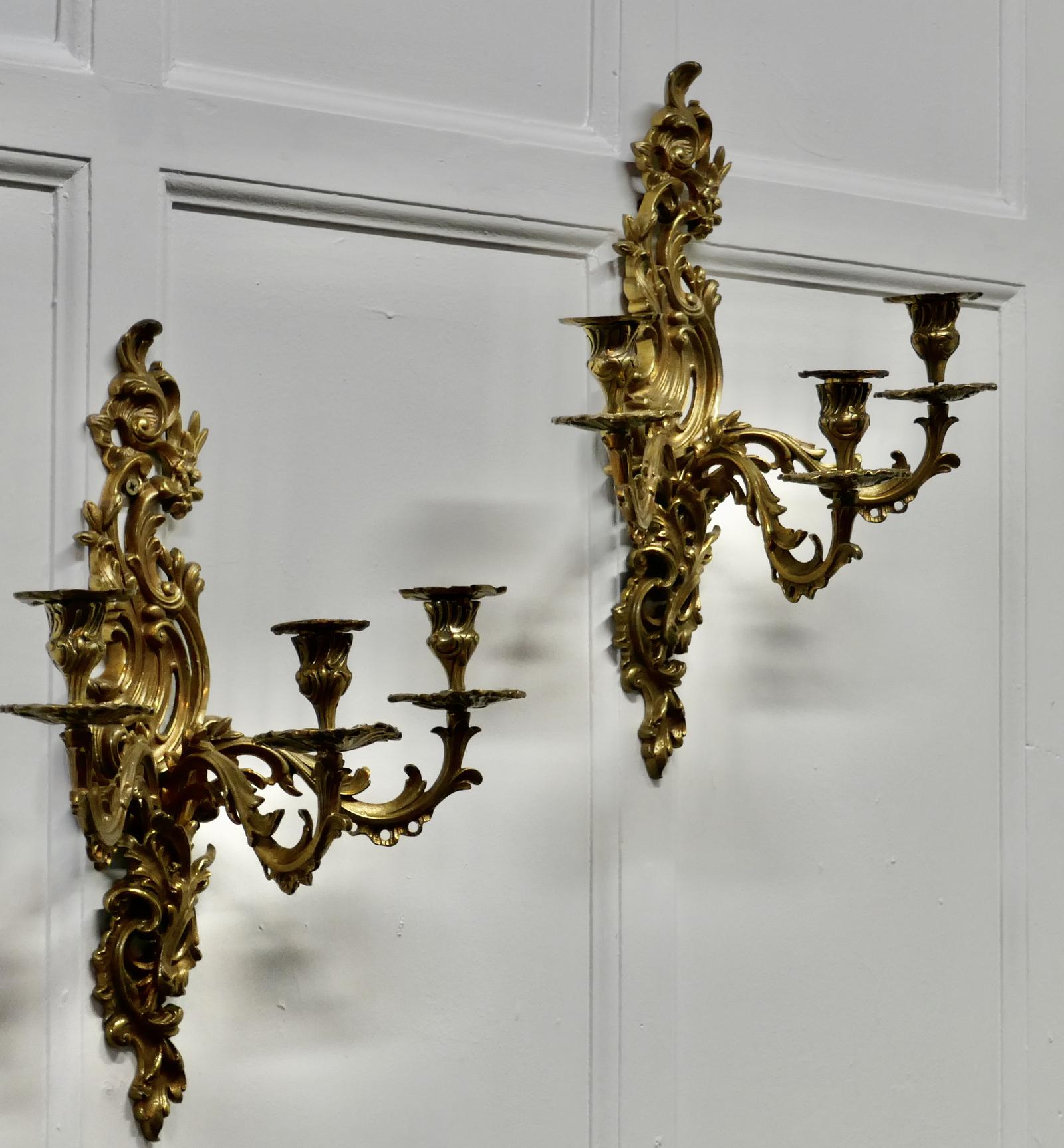 Pair of Large 19th Century Baroque French Brass Triple Wall Sconces