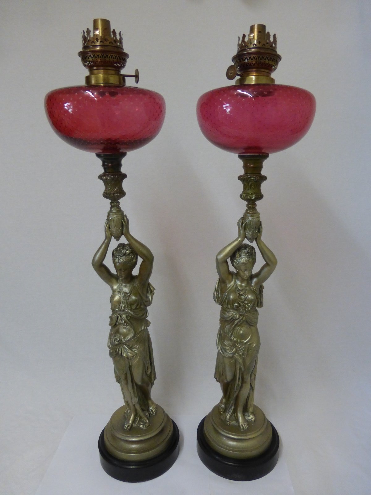 Pair of Large '29 inch' French Figural Cranberry Oil Lamps