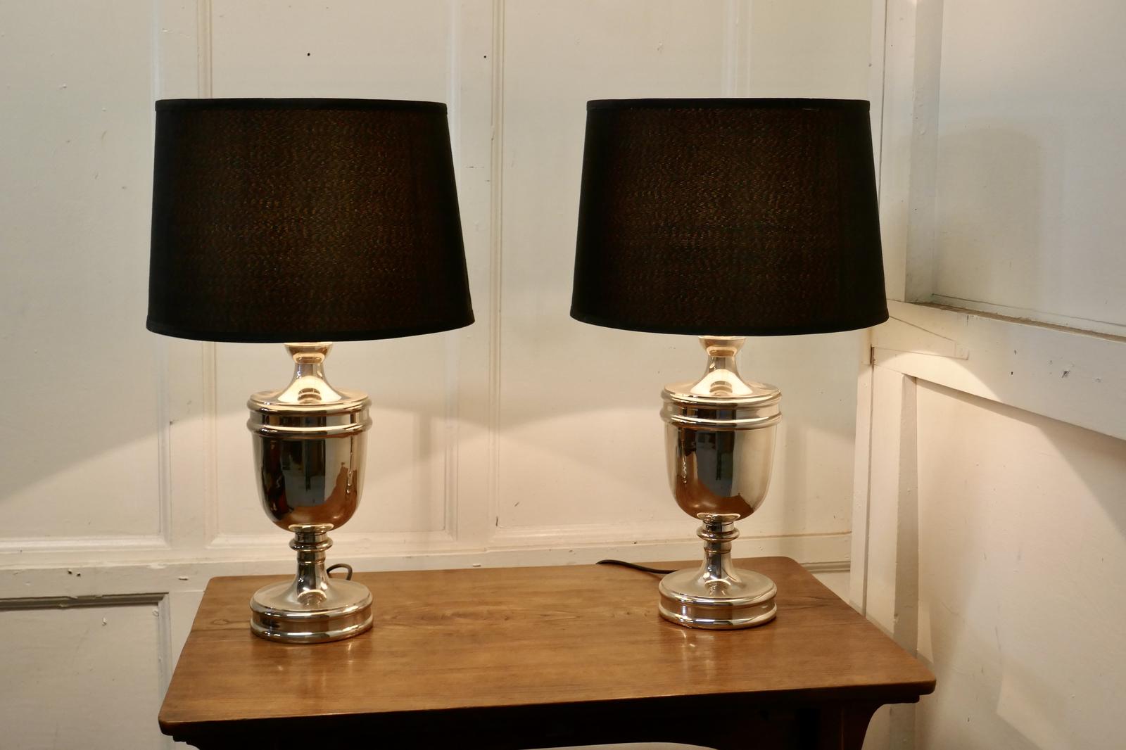 Pair of Large Art Deco Style Chrome Table Lamps with Black Shades