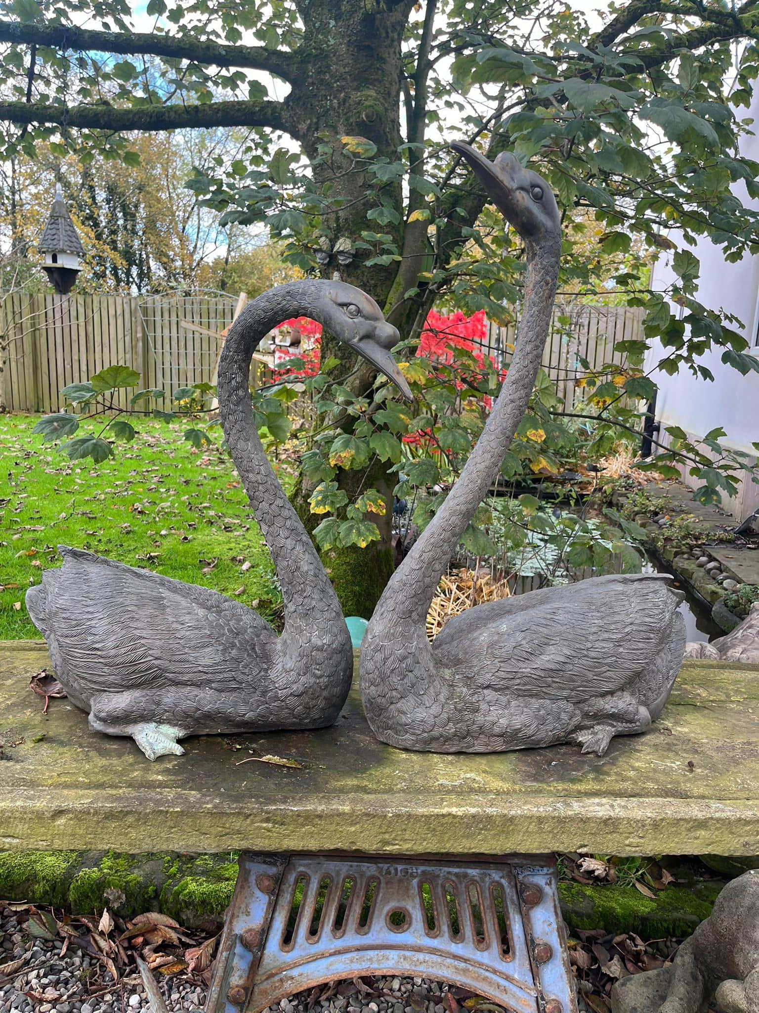 Pair of Large Bronze Antique Garden Swans