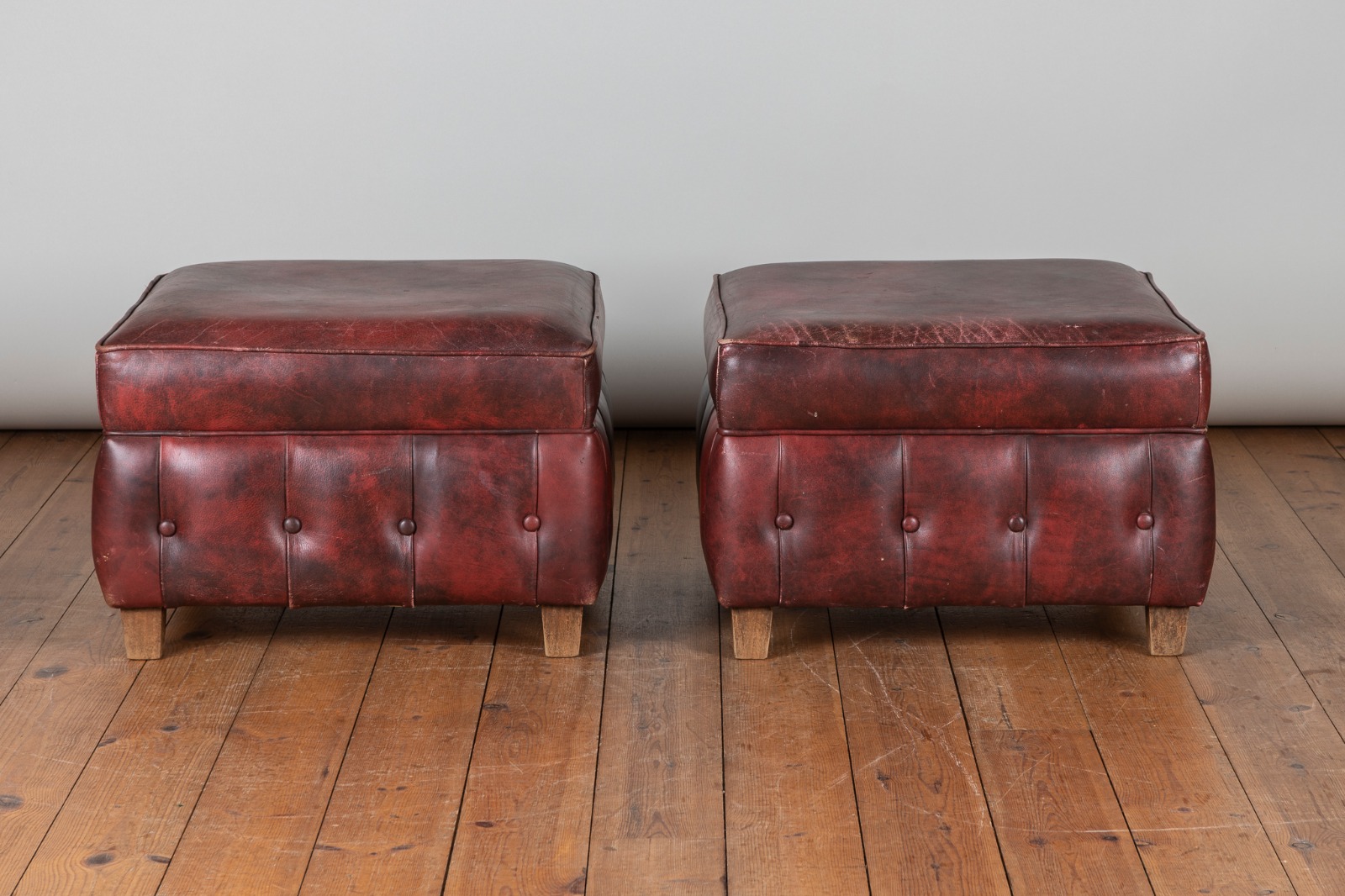 Pair of Large French Burgundy Leather Poufs / Stools (1 of 1)