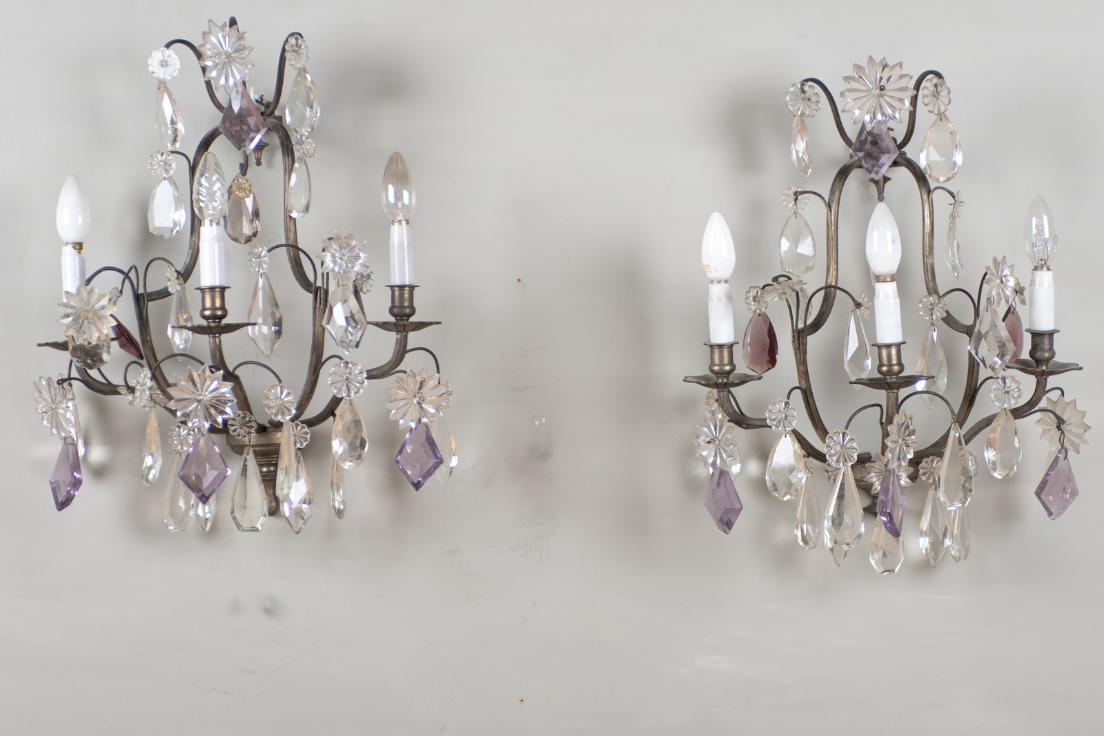 Pair of Large French Glass & Silvered Metal Wall Sconces
