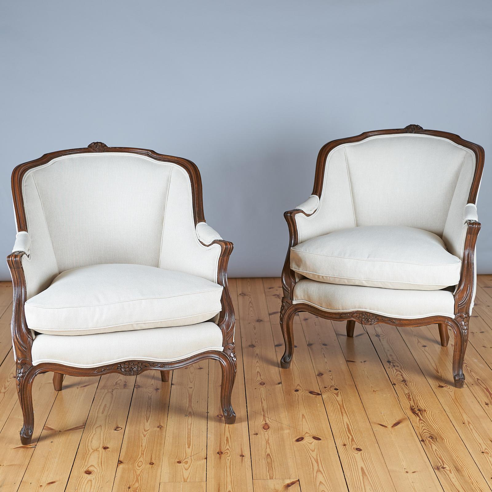 Pair of Large Louis XV Style Walnut Bergere Armchairs