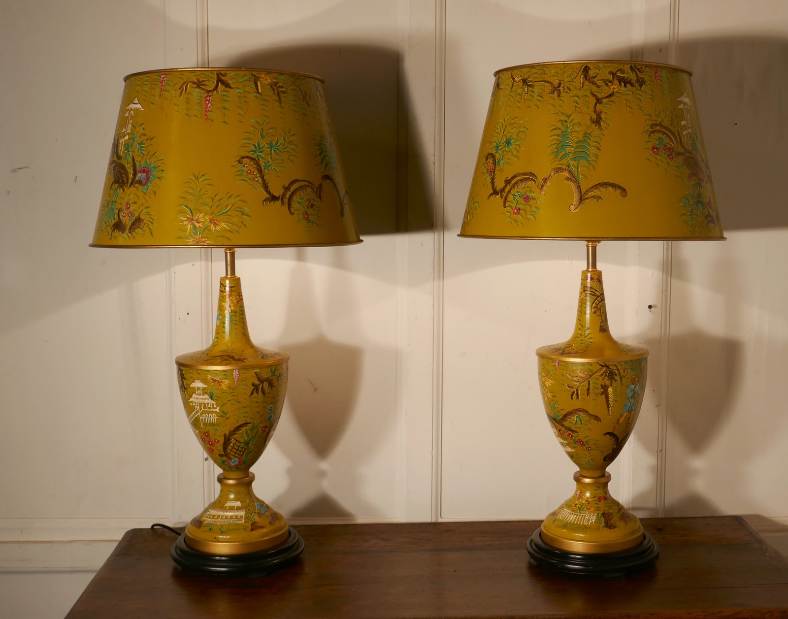 Pair of Large Mustard Yellow Chinoiserie Toleware Table Lamps
