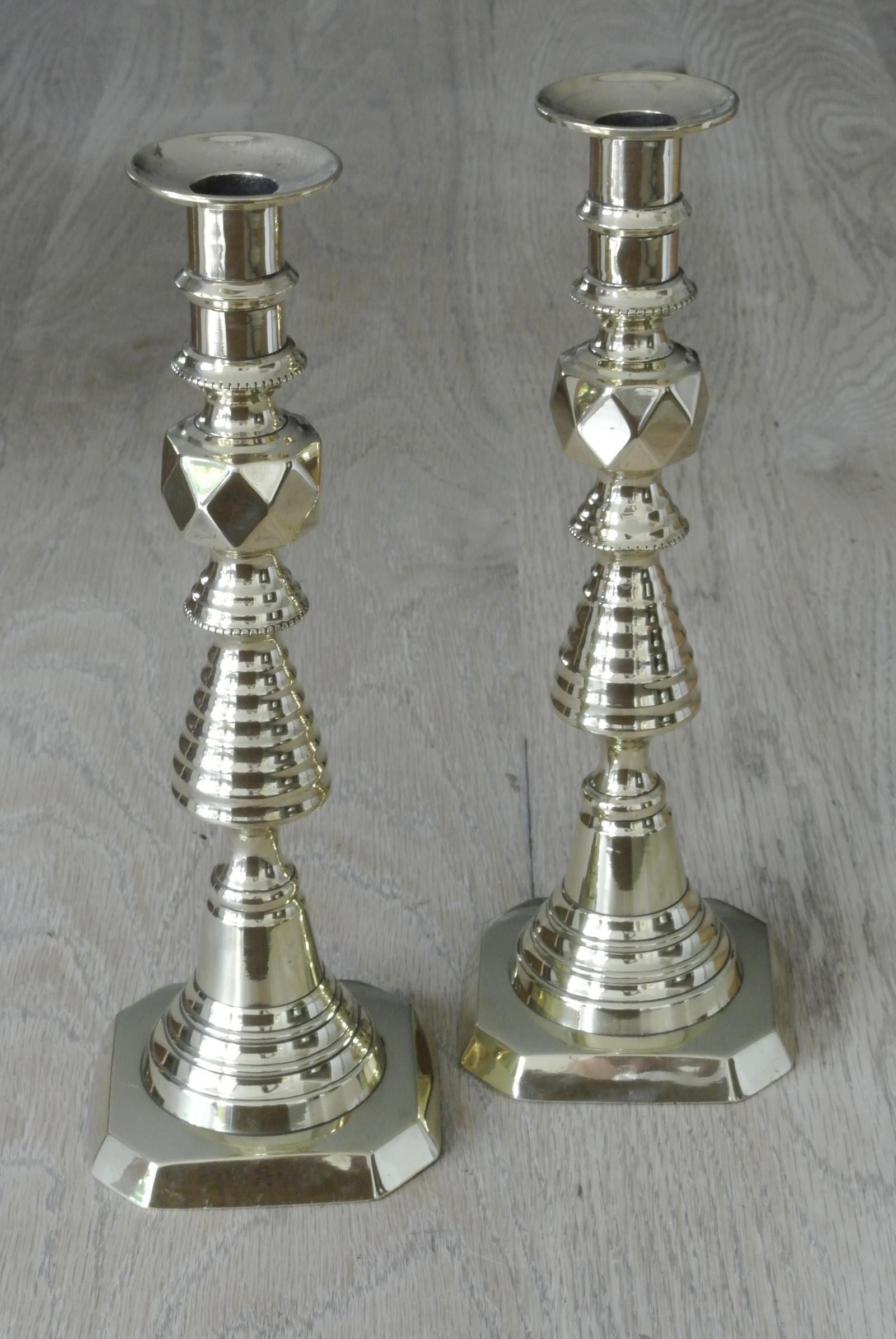 Pair of Large Victorian Beehive & Diamond Brass Candlesticks c.1890 - Pushers 11.75"