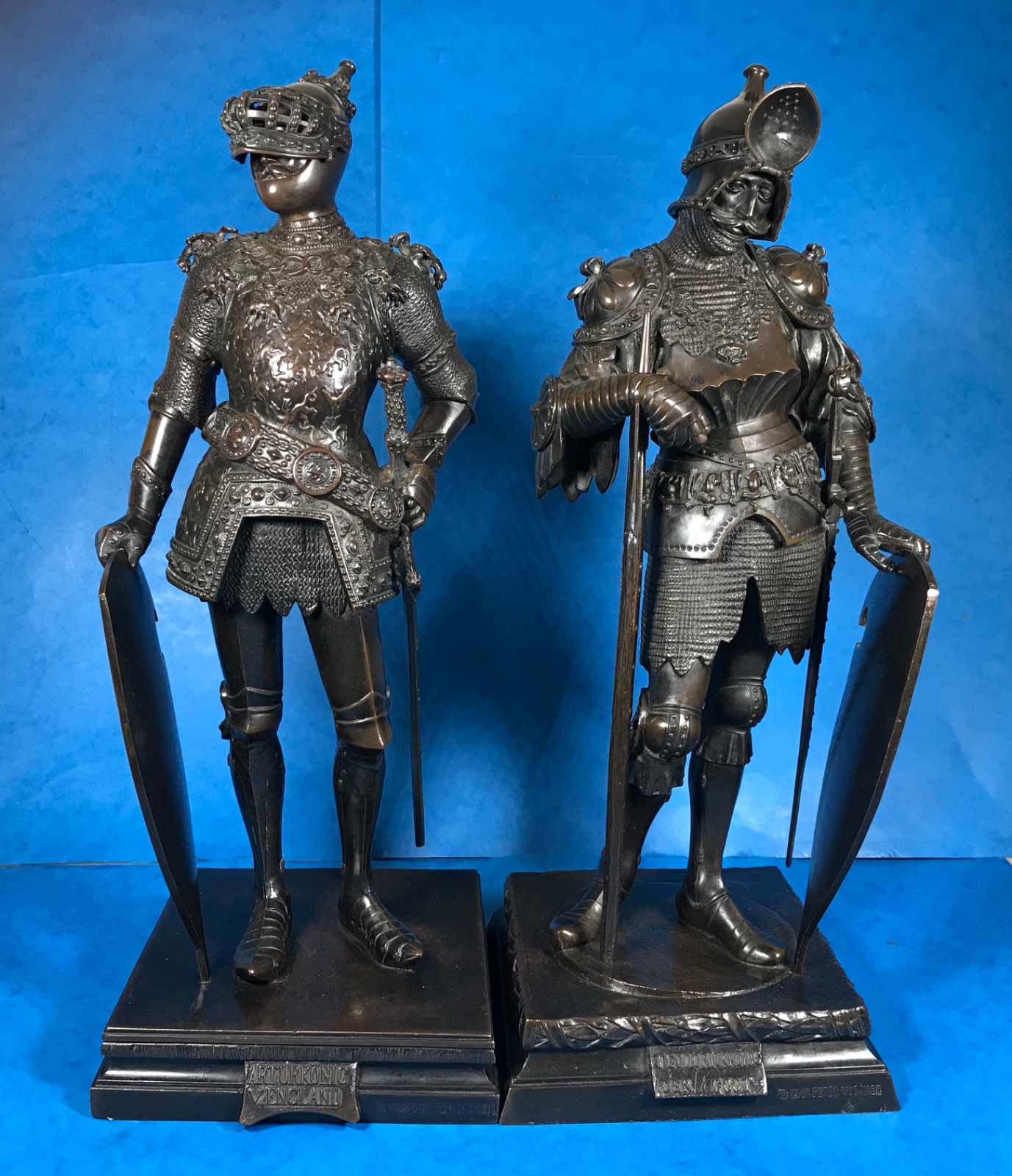 Pair of Late 19th Century Bronzed Kings in Coats of Armour, Both Signed