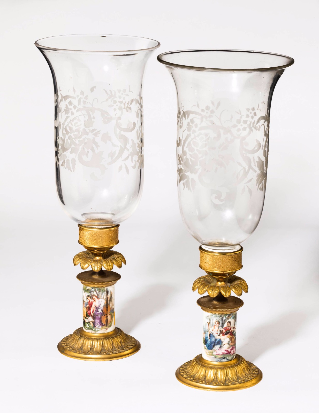 Pair of Late 19th Century Gilt Bronze Porcelain and Glass Storm Lanterns