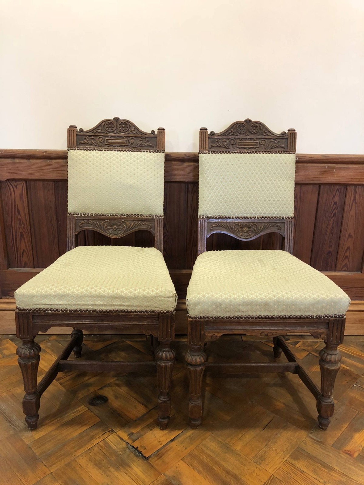Pair of Late Victorian Carved Oak Upholstered Dining Chairs