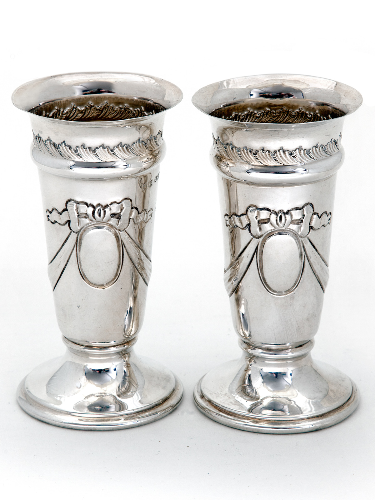 Pair of Late Victorian Trumpet Shaped Silver Vases Chased with Bows & Garlands
