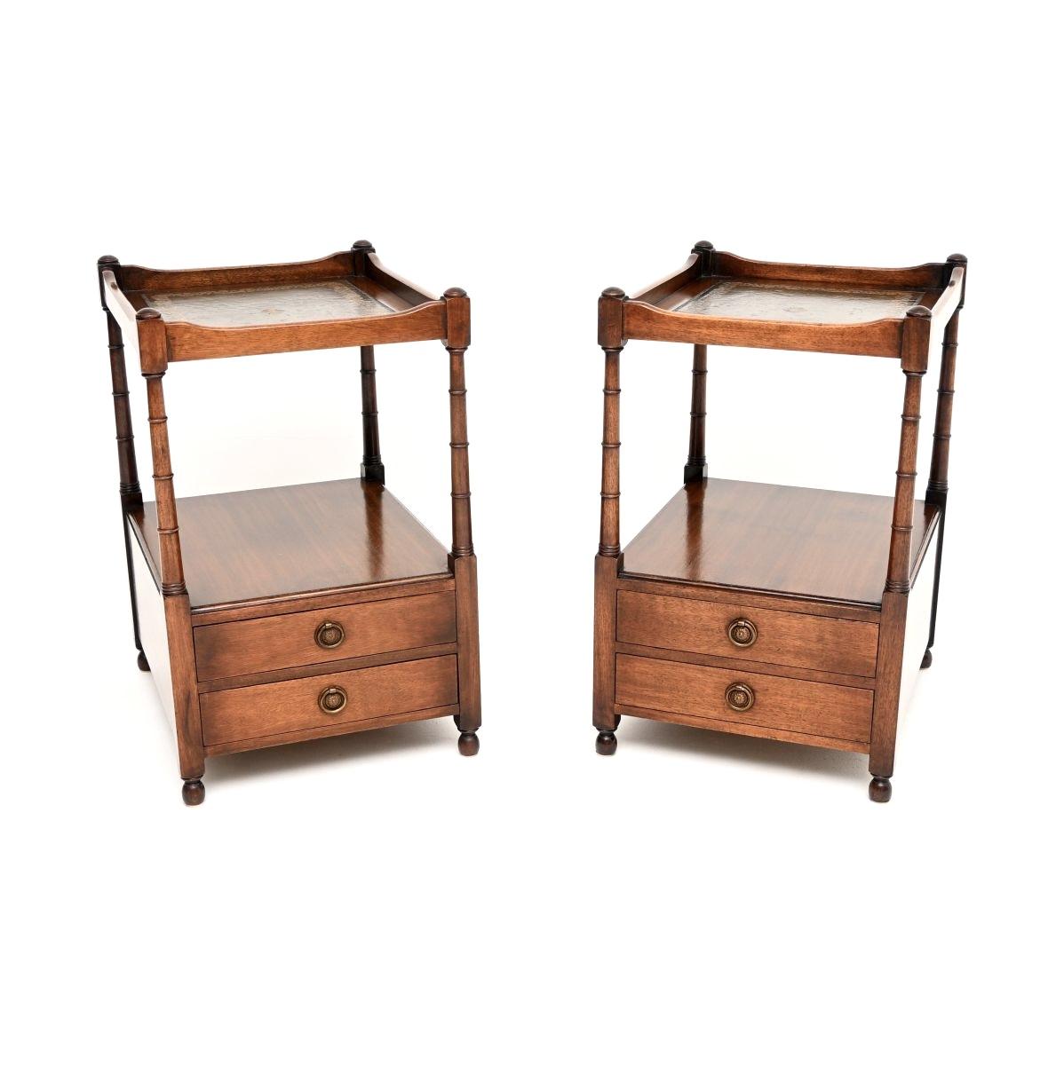 The quality is superb, they have a smart and very useful design. The tops have wonderful inset leather with tooled edges and raised gallery edges. The lower sections contain two drawers and there is a useful lower tier. They sit on bracket feet and are finished on all sides including the backs, so can be used as free standing items. They would be very useful as lamp tables in a lounge or even as bedside tables.