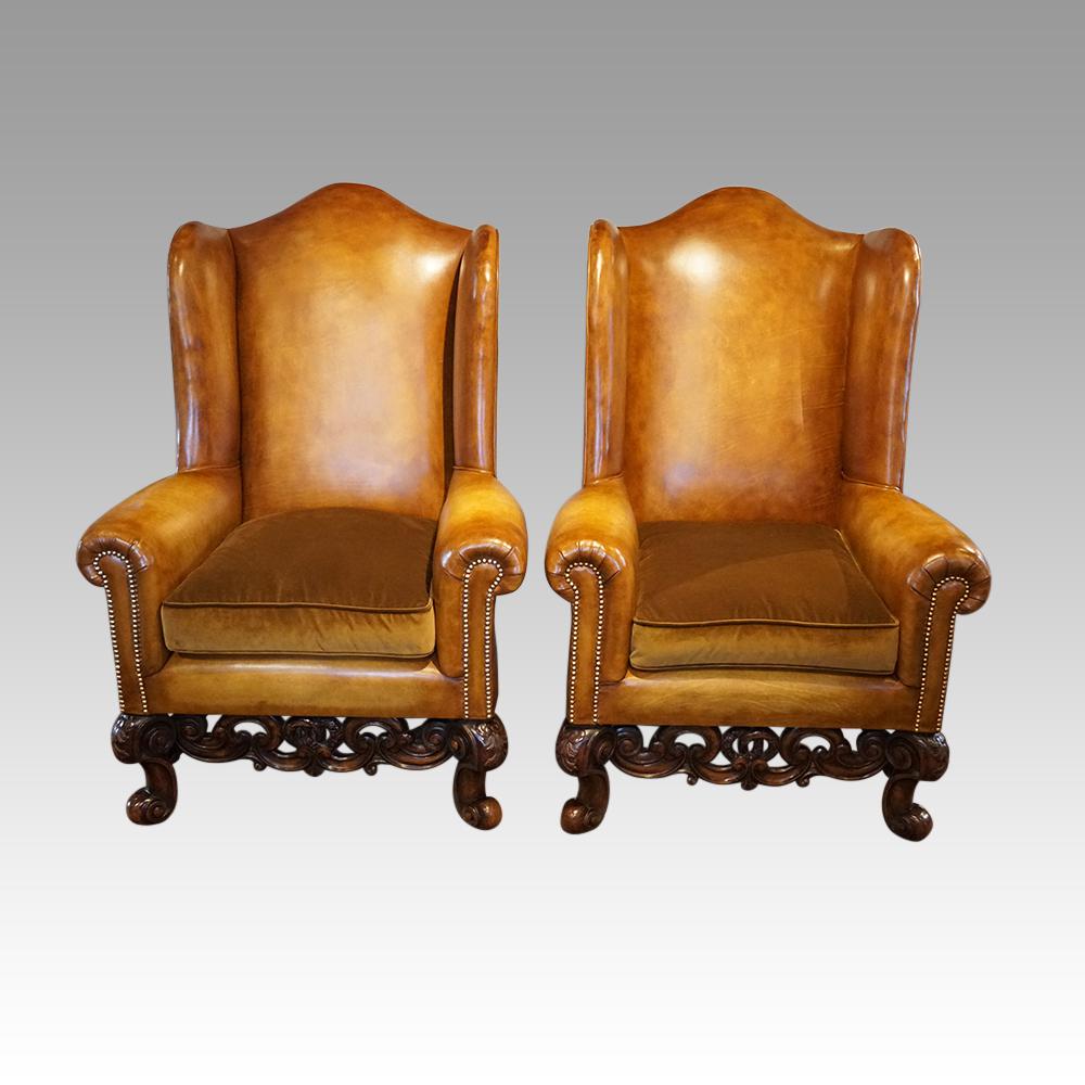 Pair of Leather & Walnut Wing Chairs
