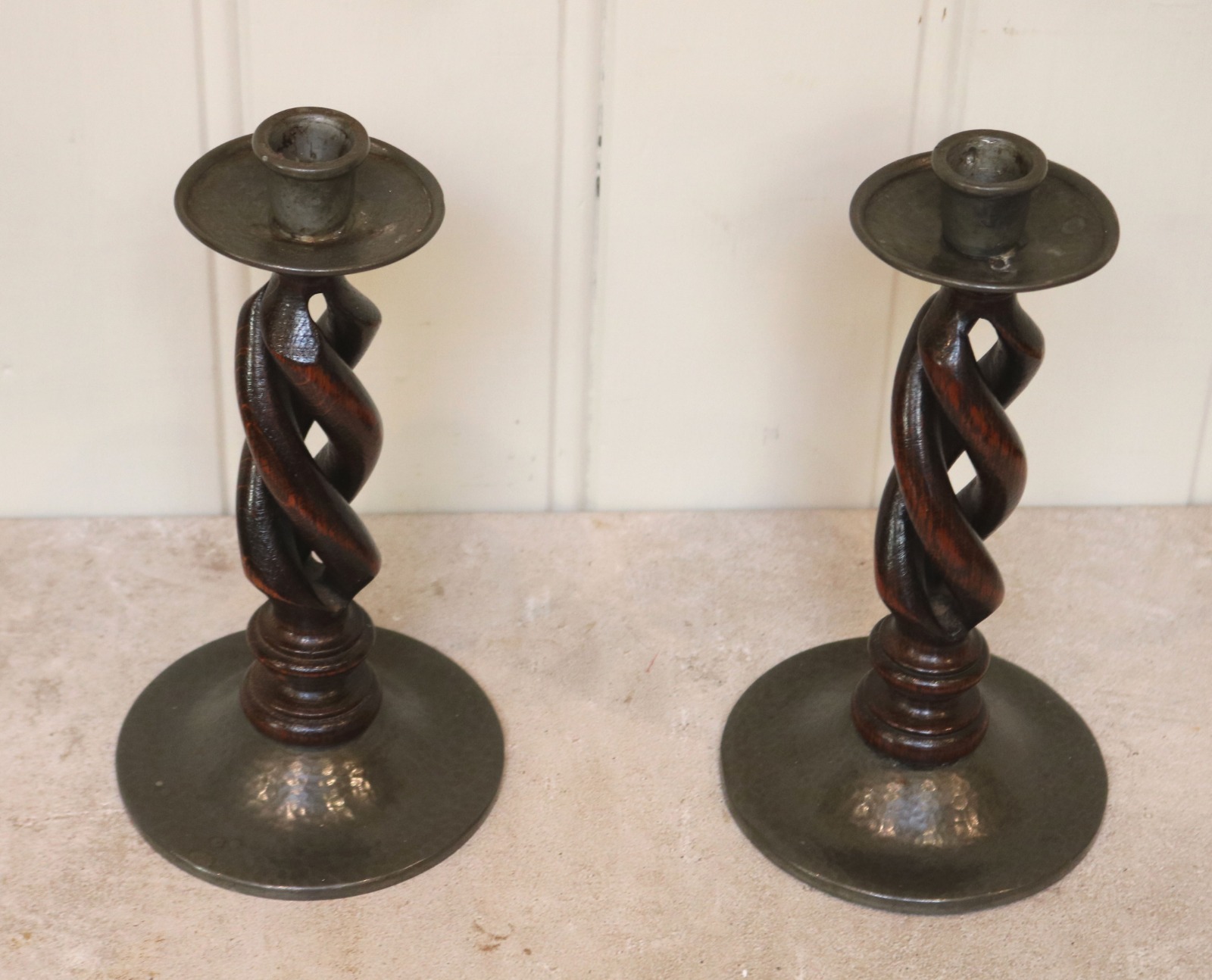 Pair of Liberty & Co Tudric Pewter and Oak Candlesticks